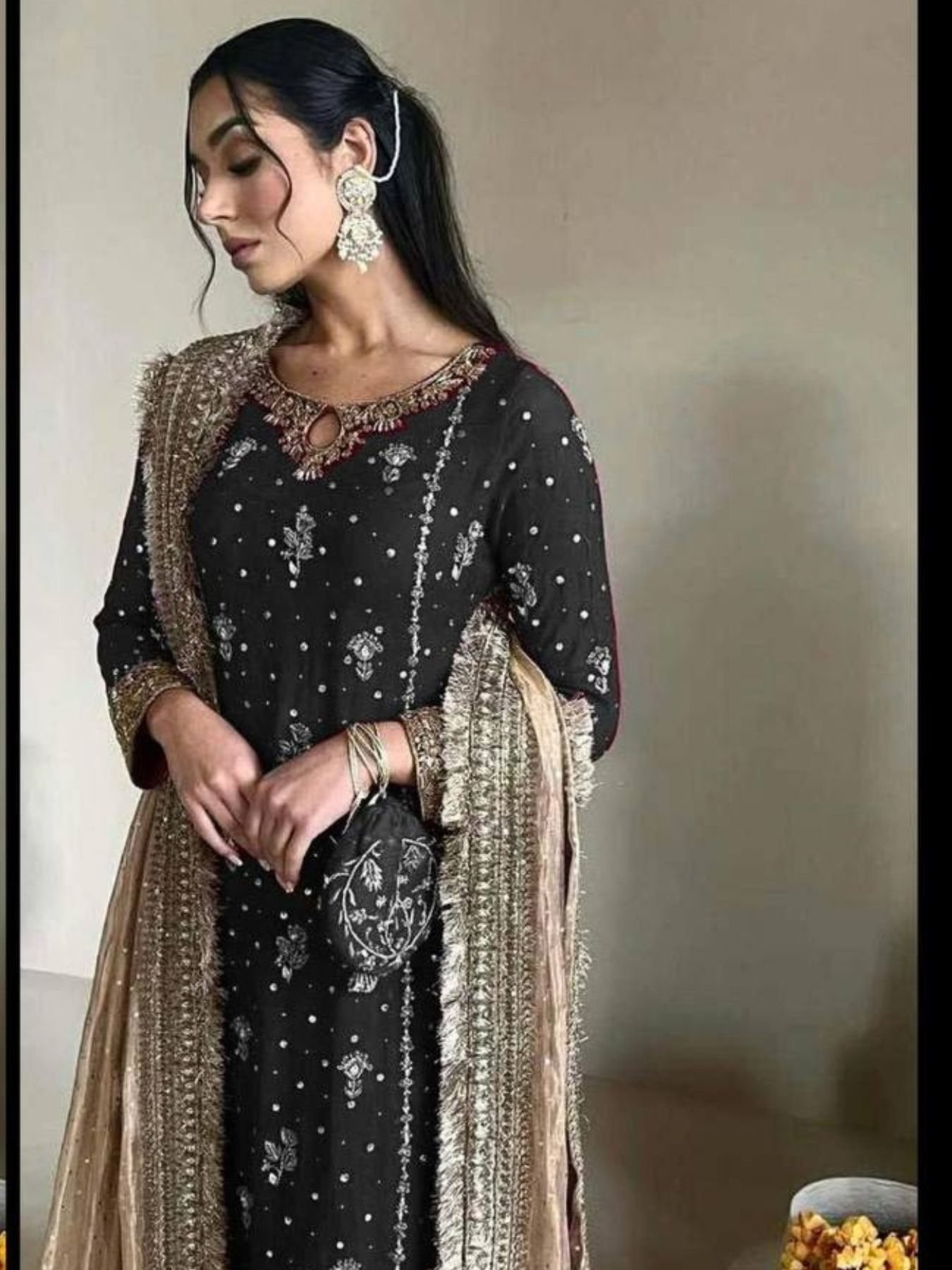 Size ChartThis designer ethnic set is crafted from premium Faux Georgette and adorned with intricate sequins embroidery and handmade moti work. The outfit includes a beautifully embroidered top, a matching pant with elegant lace work, and a net dupatta with heavy border lace detailing.