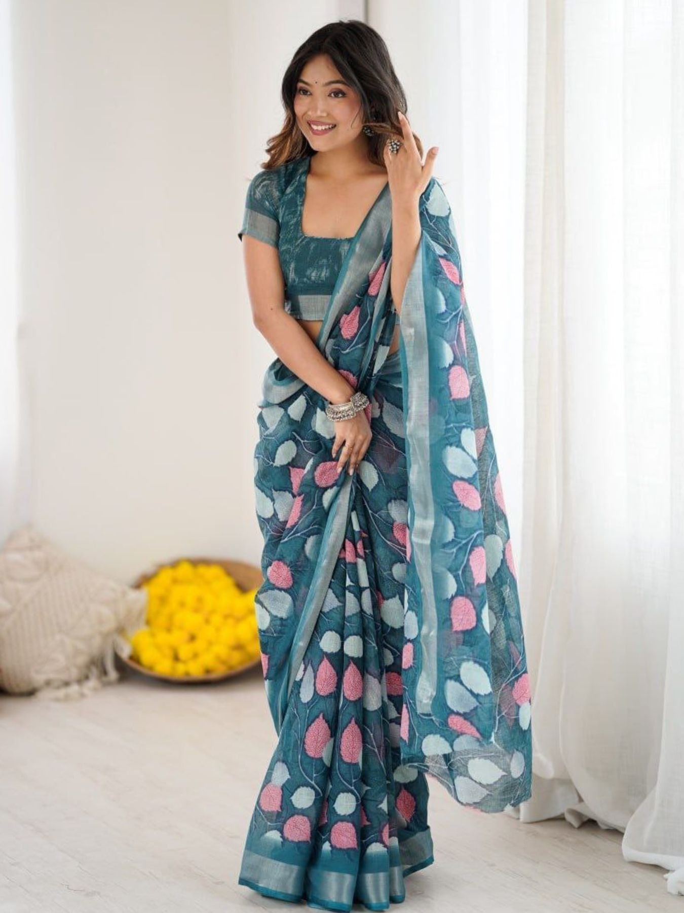 Teal Lilan Patta Printed Saree with Georgette Blouse Trendy Daily Wear