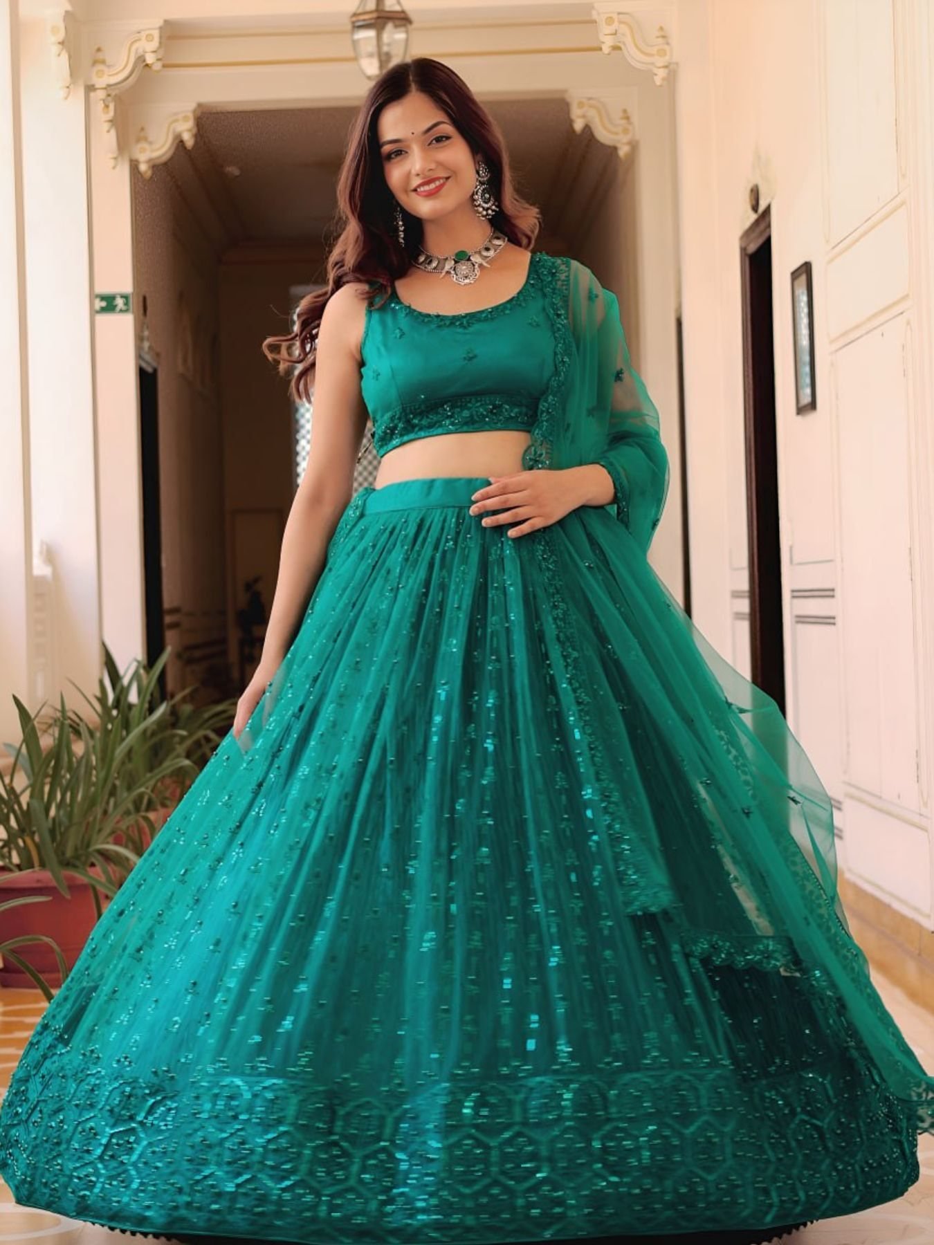 Teal Net Party Wear Lehenga Monochrome Sequins and Pearl Work for Weddings