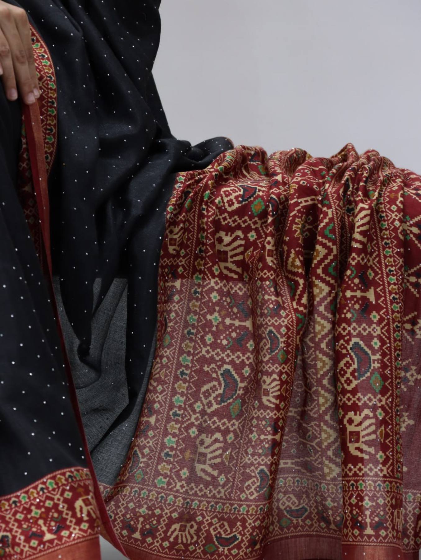 Timeless Black Mull Cotton Patola Print Saree with Sirovski Diamond And Zari Border