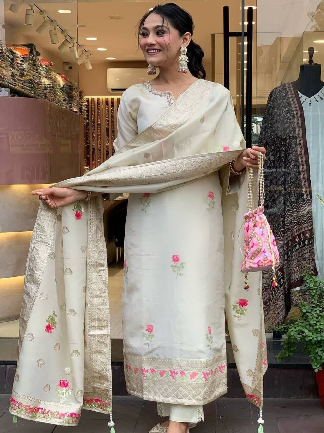 Add timeless elegance to your ethnic wardrobe with this premium shimmer jacquard ensemble featuring intricate embroidery, floral motifs, and a matching dupatta. Perfect for weddings, festive gatherings, and special occasions.