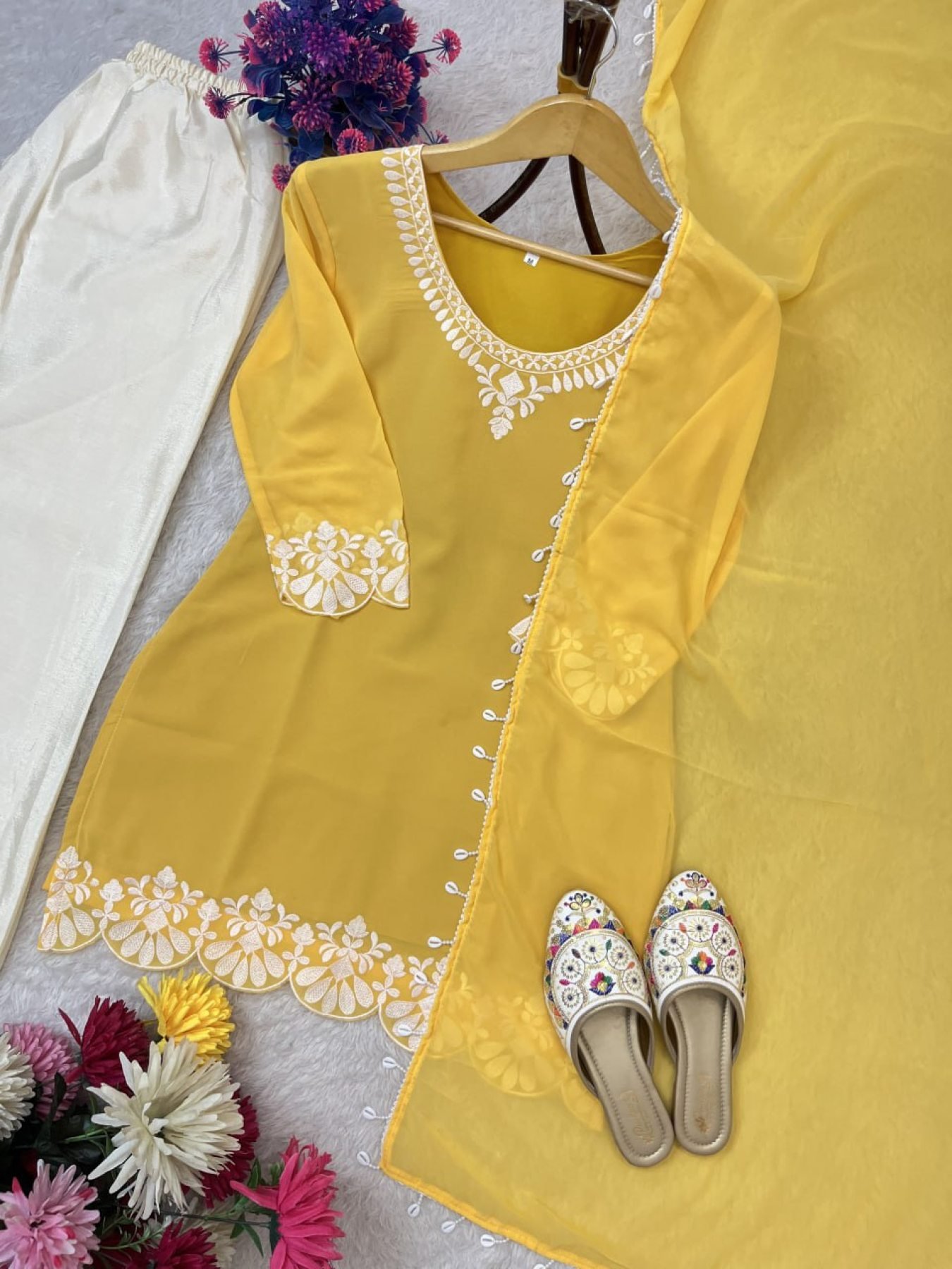 Celebrate the season in style with this festival special 3-piece set. Designed with a faux georgette embroidered top, paired with a luxurious chinon silk embroidered palazzo, and finished with a lace-bordered georgette dupatta, this outfit blends comfort, elegance, and premium craftsmanship. Fully stitched & ready to wear, ideal for festivals, parties, and weddings.