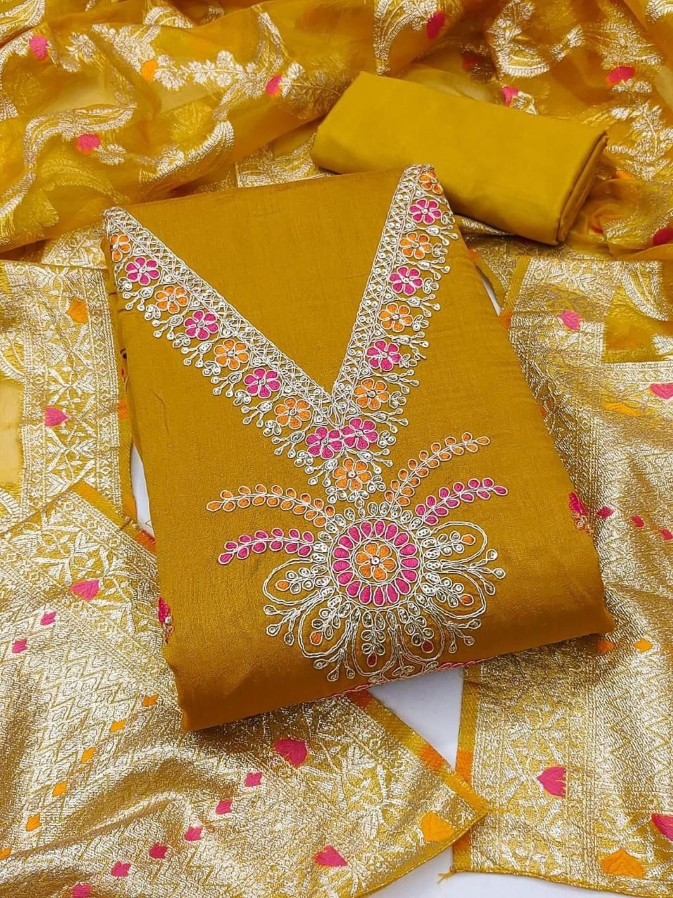 Yellow Vichitra Silk Dress Material with Sequence Embroidery Wholesale Collection