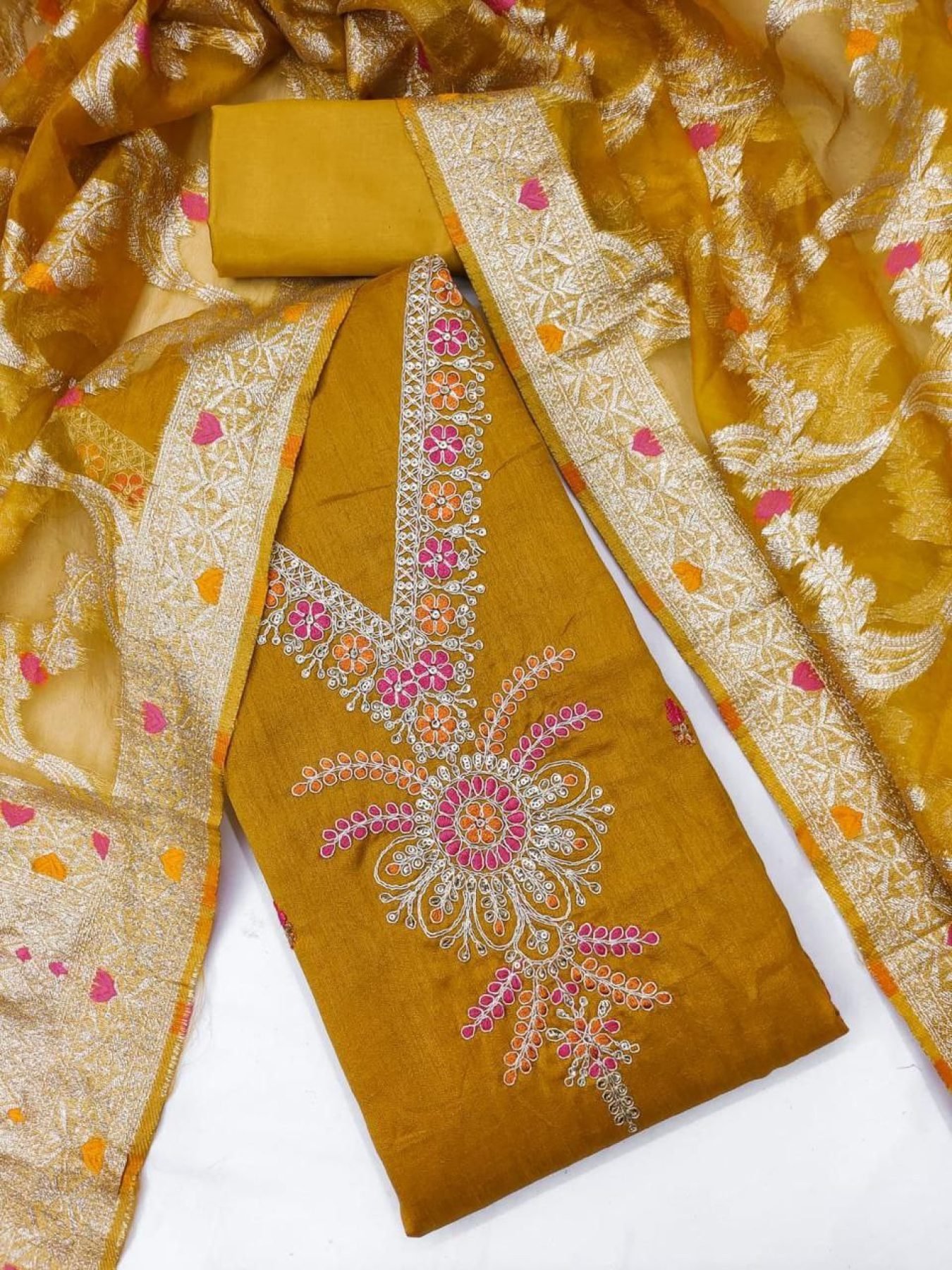 Upgrade your festive wardrobe with this premium designer dress material set, crafted in rich fabrics with elegant embroidery and sequence detailing.