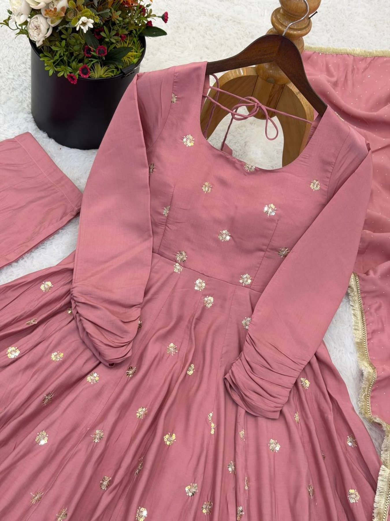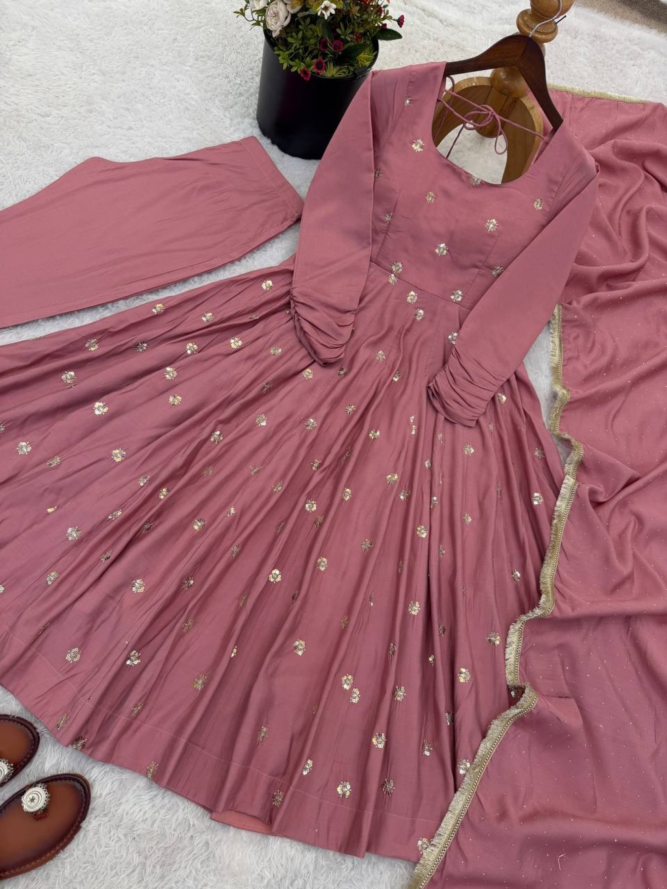 2026 Roman Silk Embroidery Work Long Anarkali Gown with Pant and Jarkan Work Dupatta Set