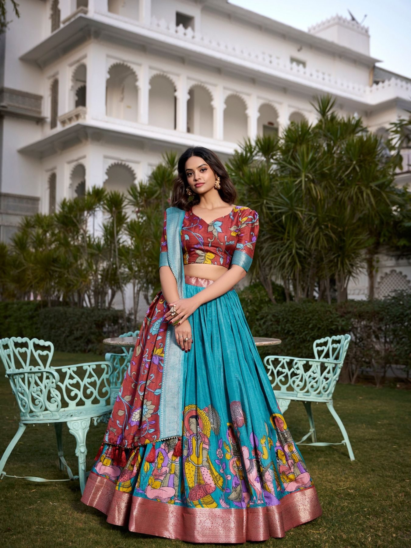 A exquisite Tussar Silk Lehenga Set with Perfect Firozi patola print design Ceremonial Wear