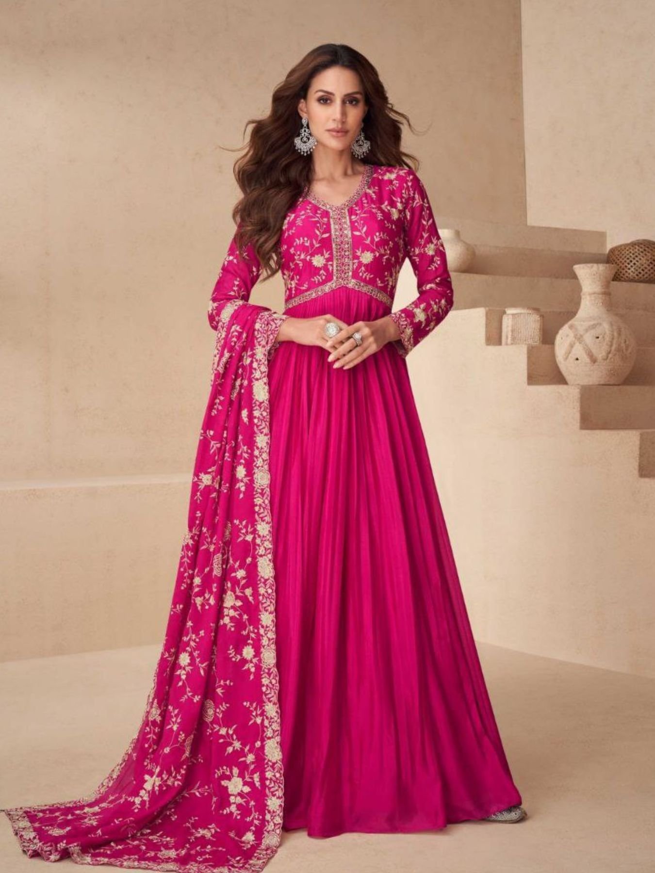 Aashirwad Pink Chinnon Silk Gown Set for Women Party Wear and Wedding Look