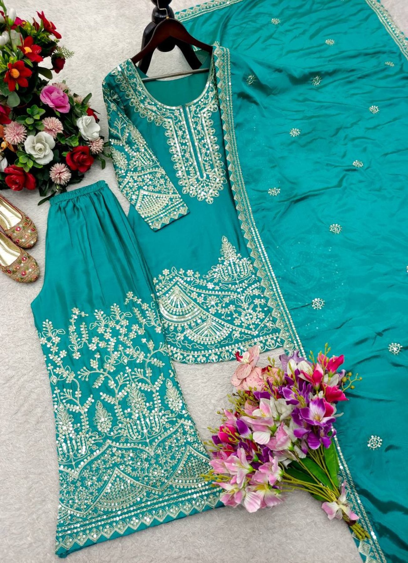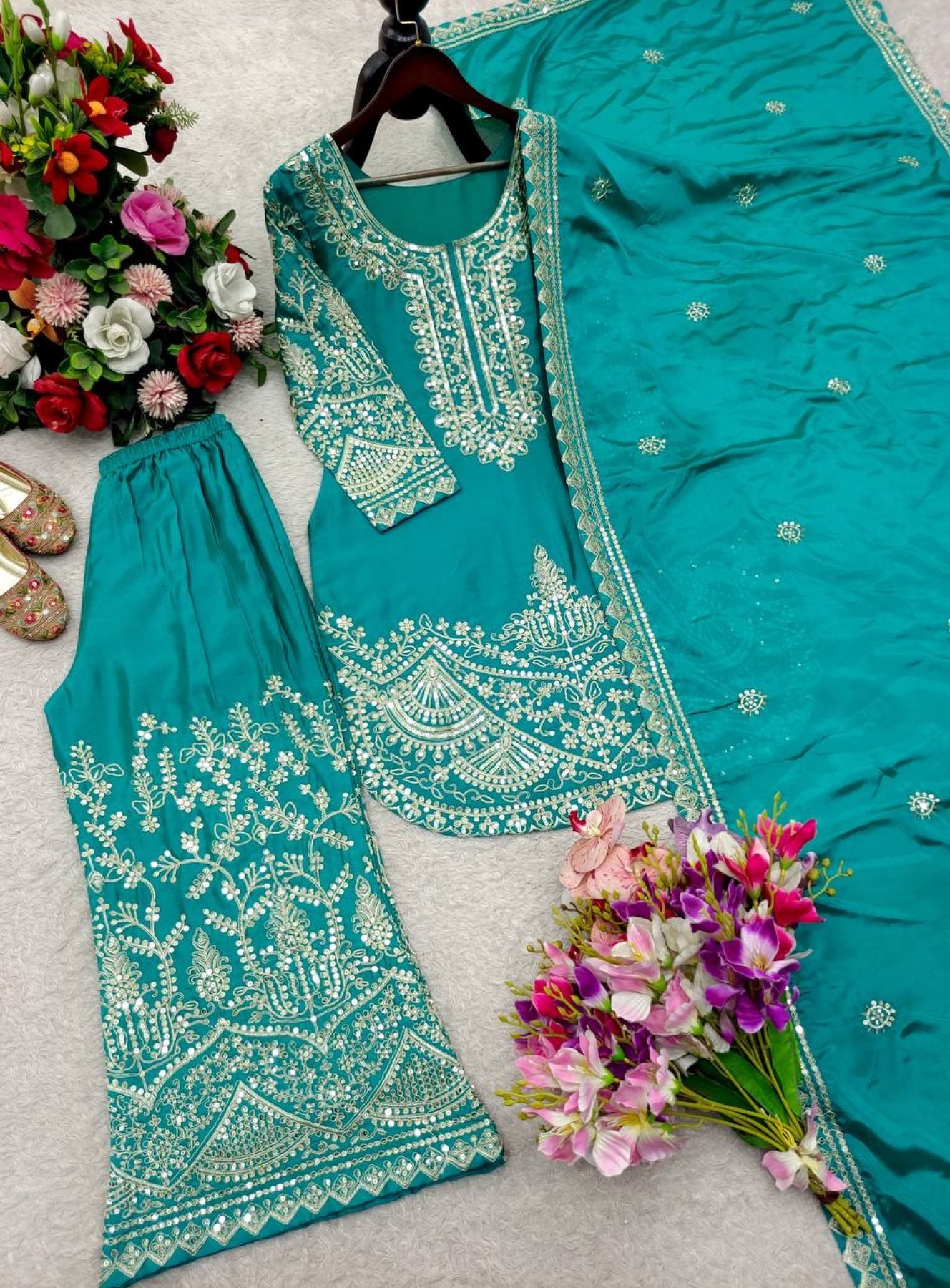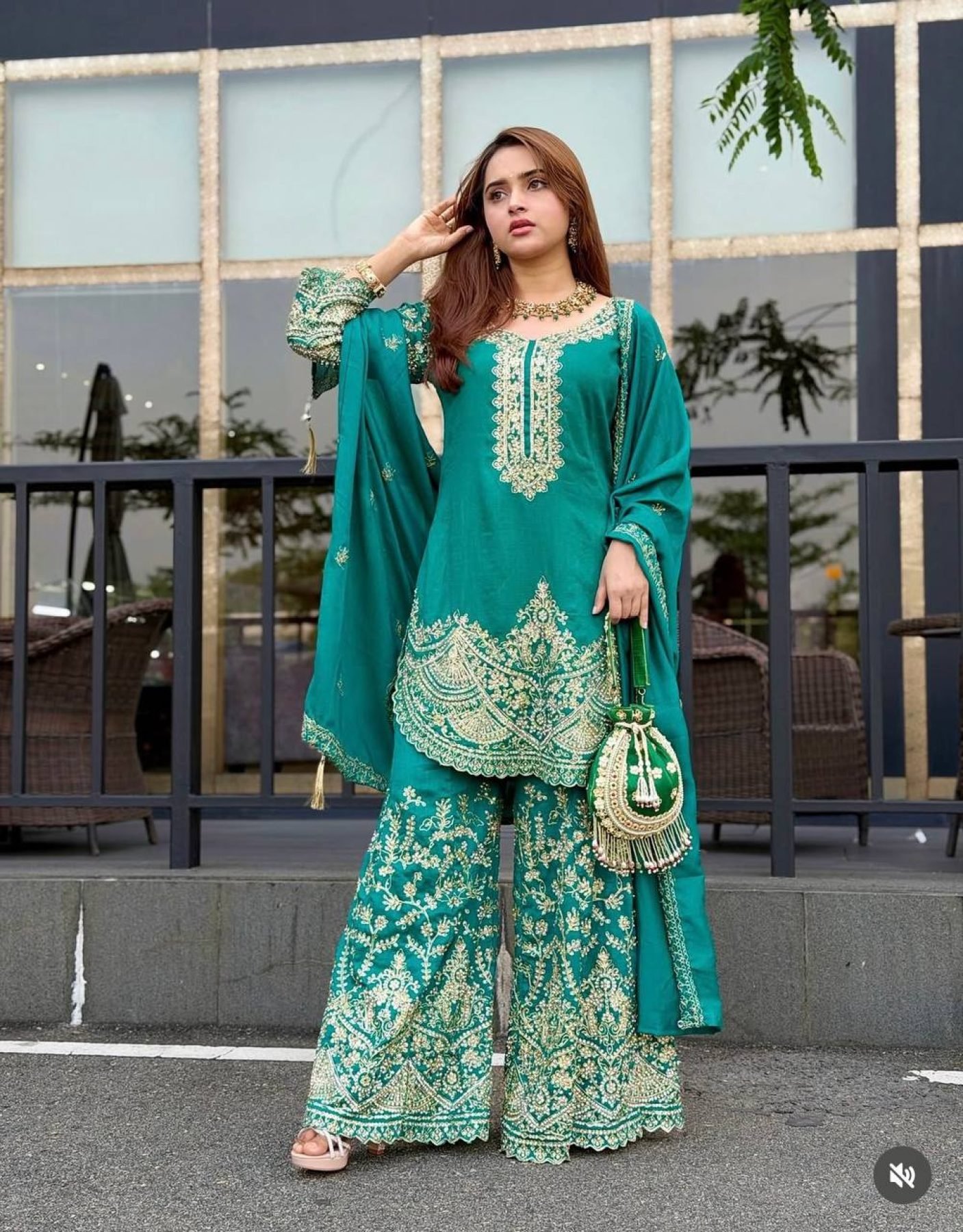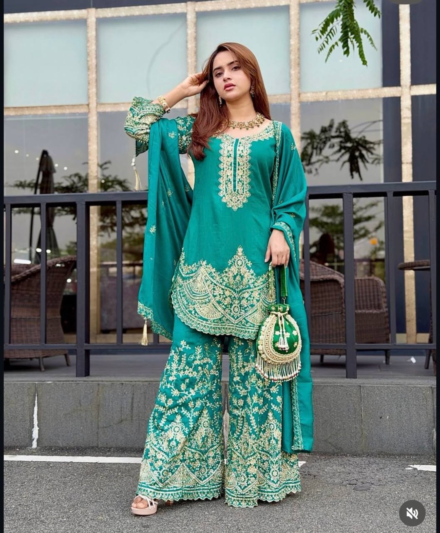 Premium chinon silk suit set featuring heavy embroidery with sequins and coding dori work on top, palazzo, and dupatta. Perfect for festive and party wear.