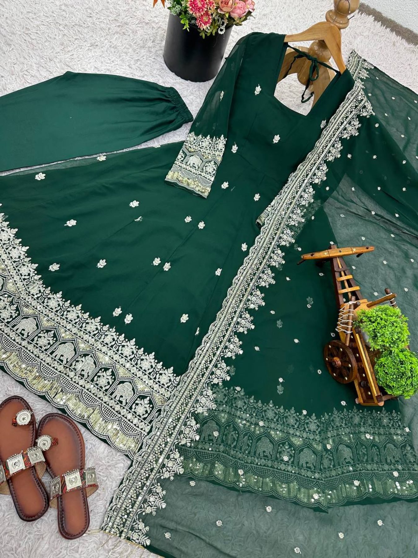This premium gown set features heavy Georgette fabric with a grand 4-meter flair, full sleeves, and soft micro cotton lining for luxurious comfort.