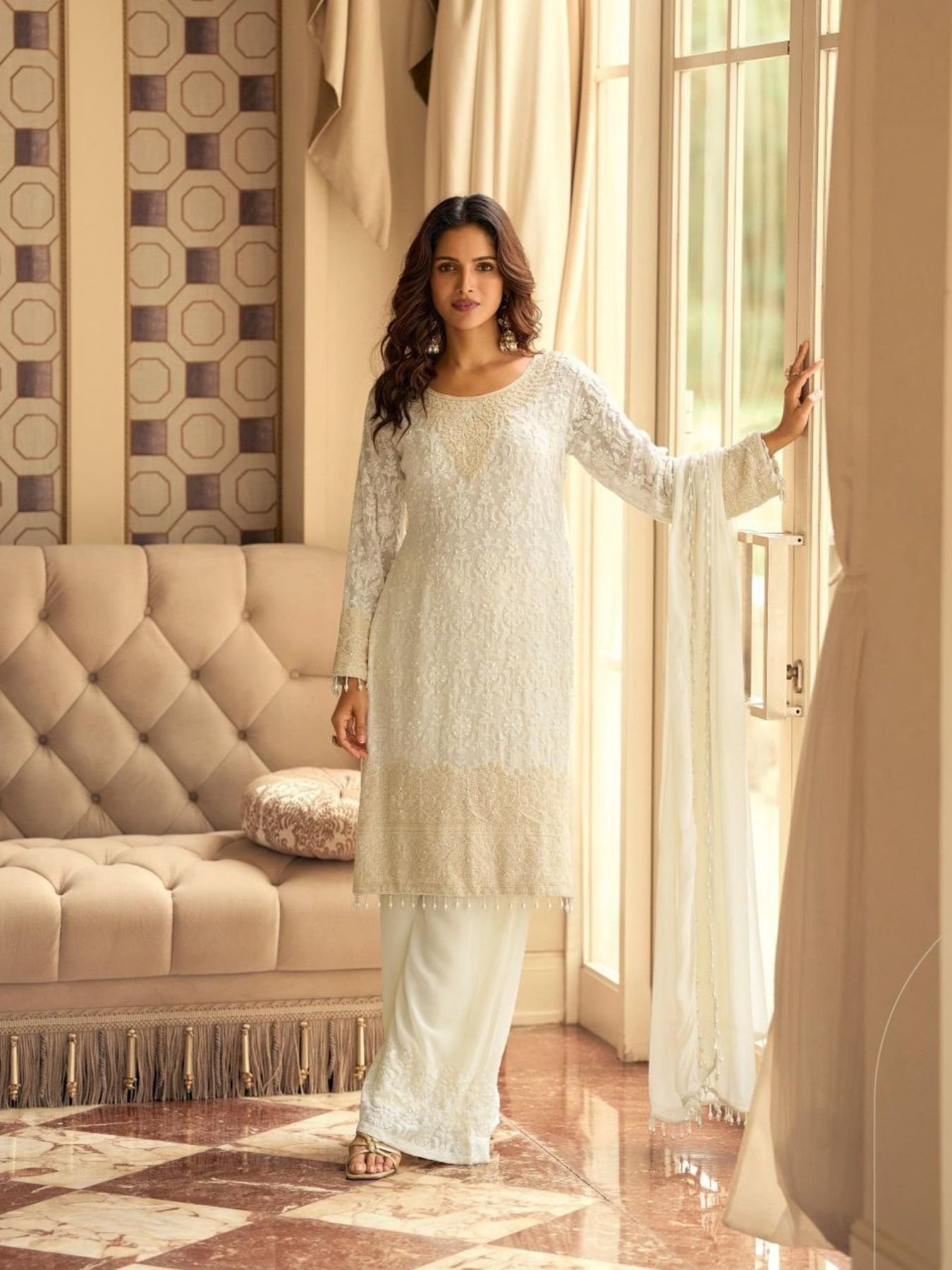 Premium real georgette designer set with heavy beads embroidery work. Fully stitched free-size top plazzo with matching dupatta. Perfect for party wear, festive wear, and export-quality wholesale collections.