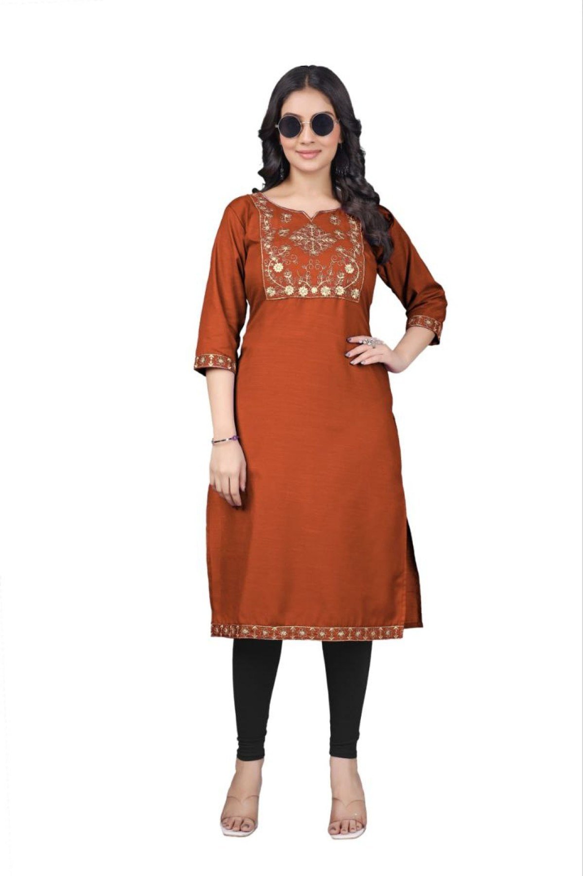 Affordable Designer Orange Tesla Cotton Kurti with Clean Embroidery Finish