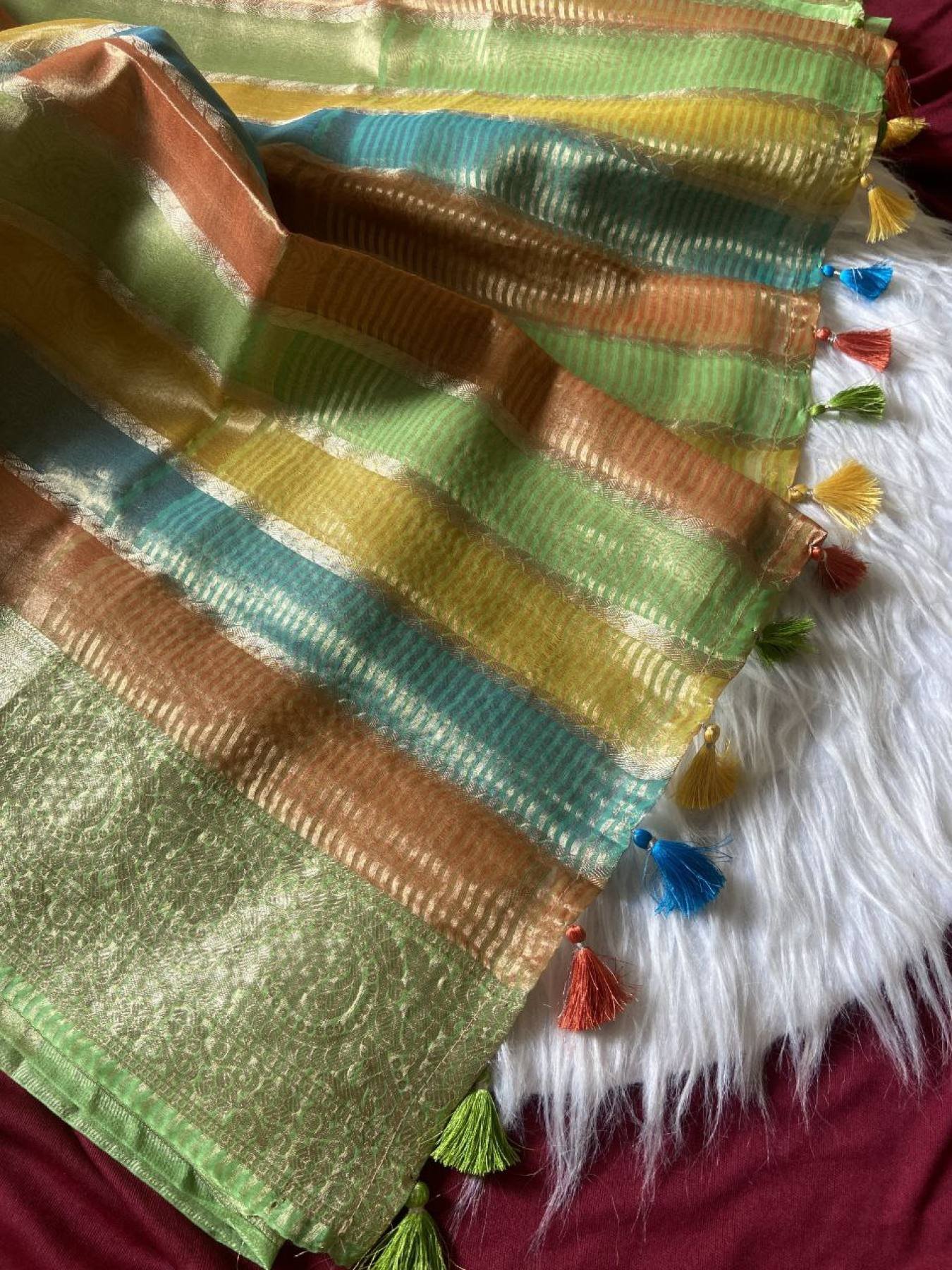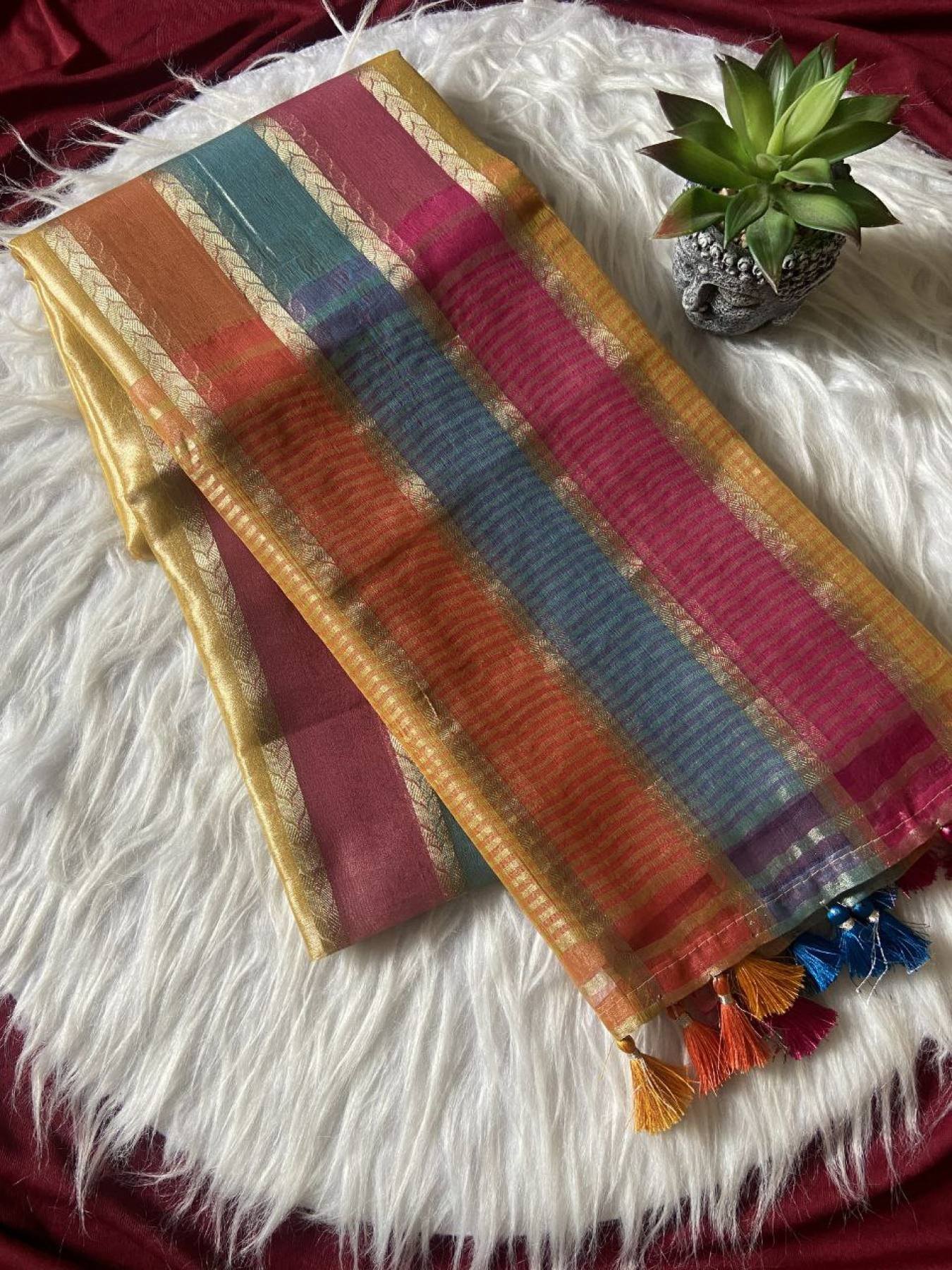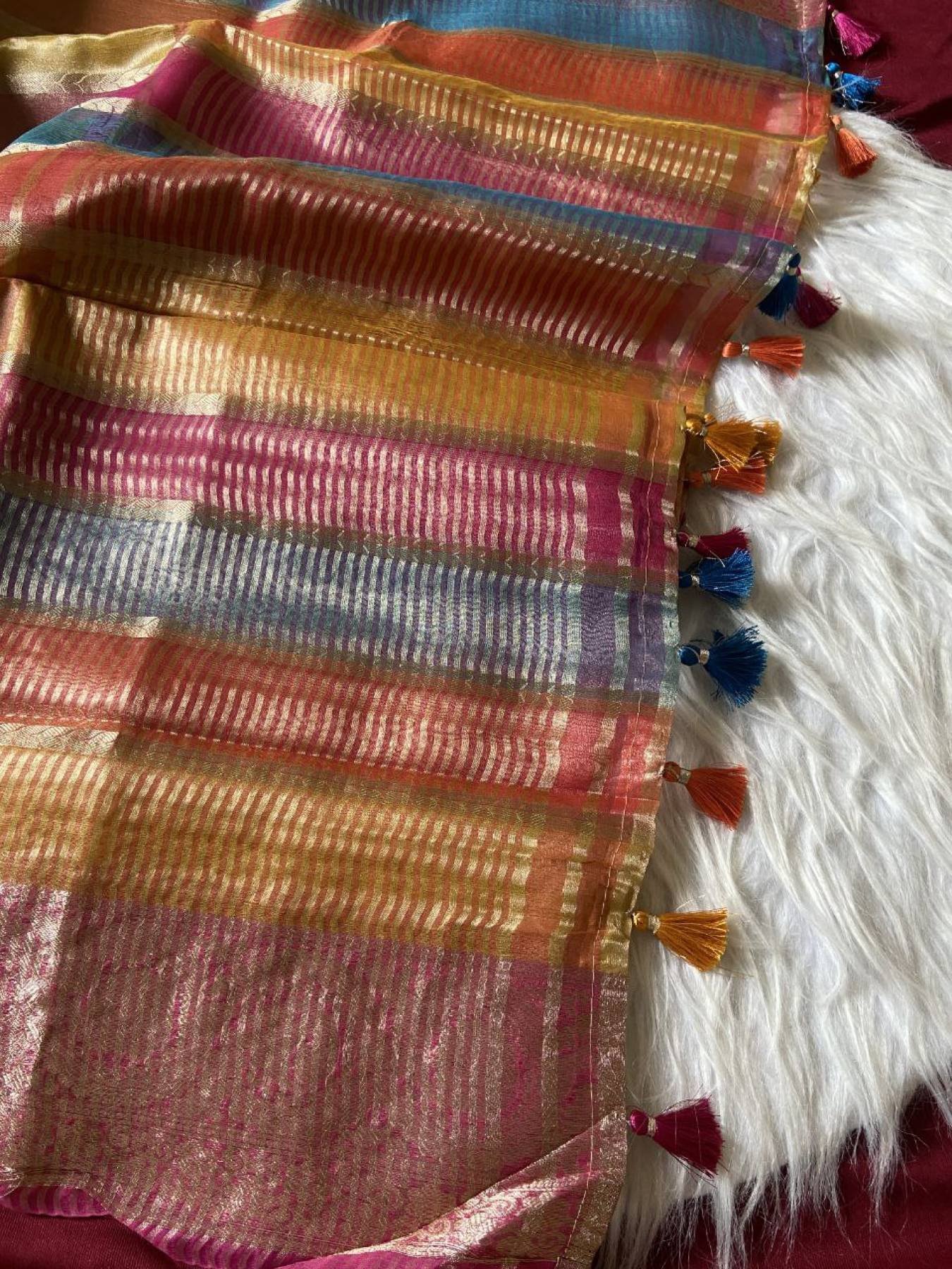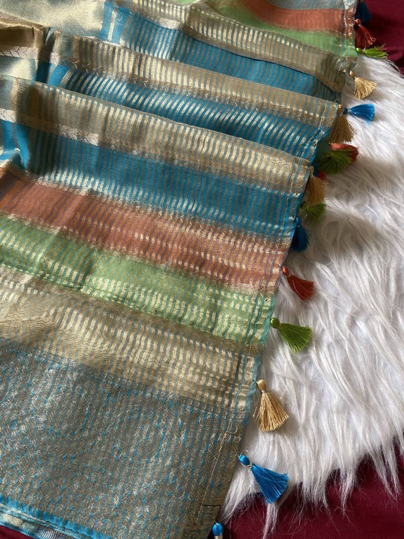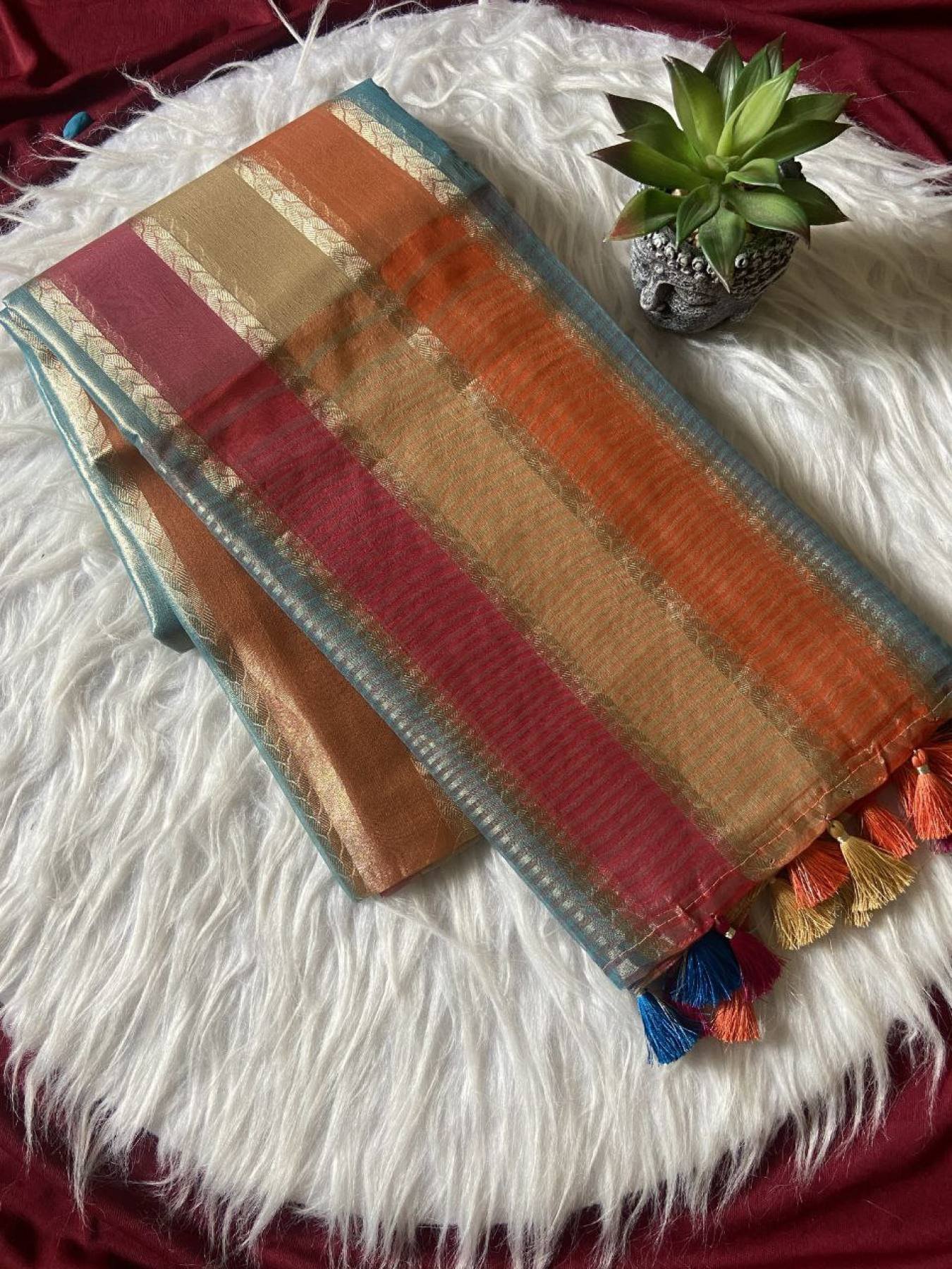 Experience elegance redefined with our Soft Tissue Silk Sarees, crafted with beautiful weaving and an attractive traditional design. This saree features a matching woven blouse and graceful tassel edging, offering a luxurious drape and rich texture that’s perfect for festive, party, or wedding wear.