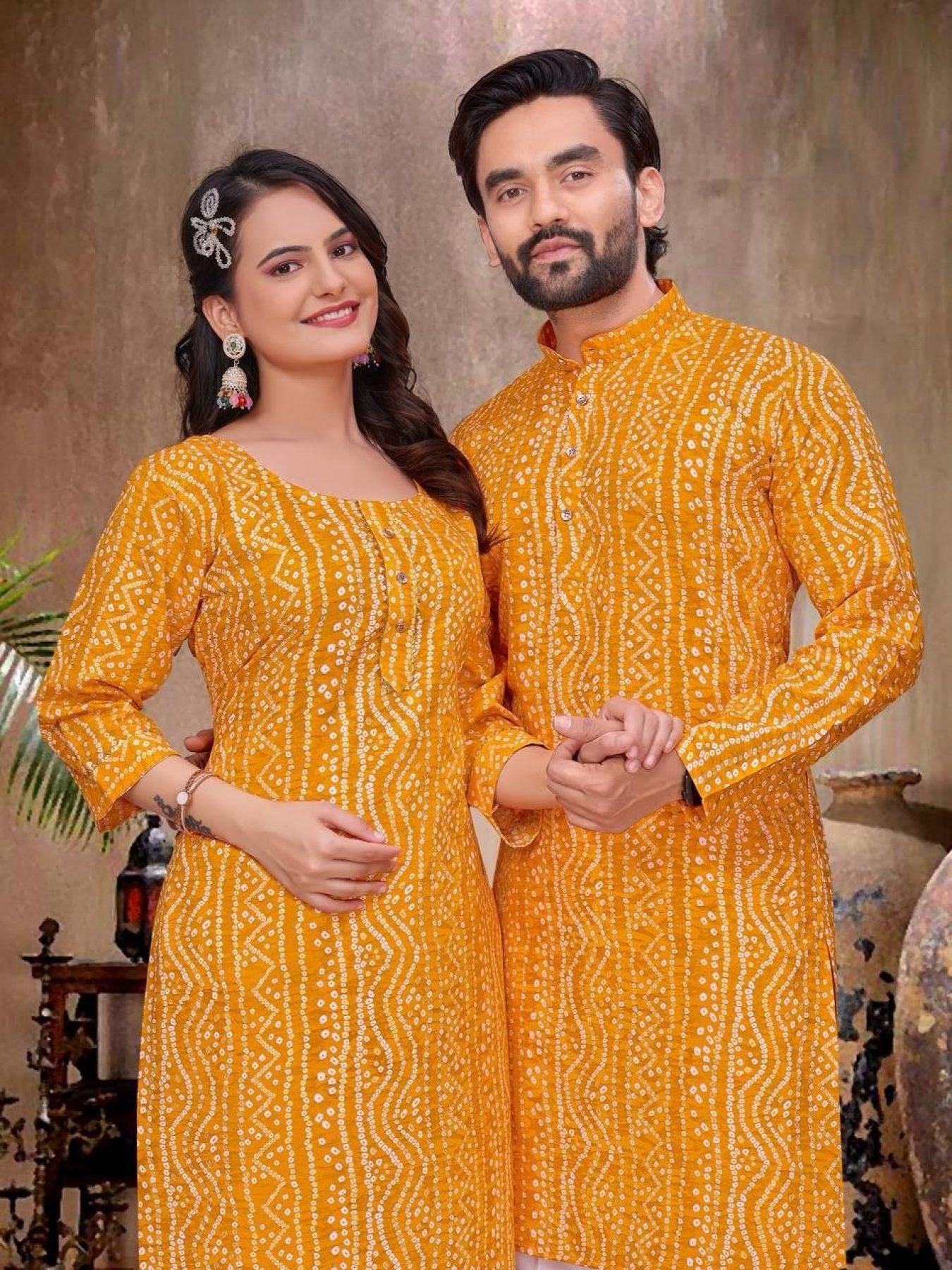 Stylish matching couple combo set crafted in soft rayon featuring elegant bandhani foil print. Designed for comfort and coordinated style, this set is perfect for festive wear, weddings, and traditional occasions.