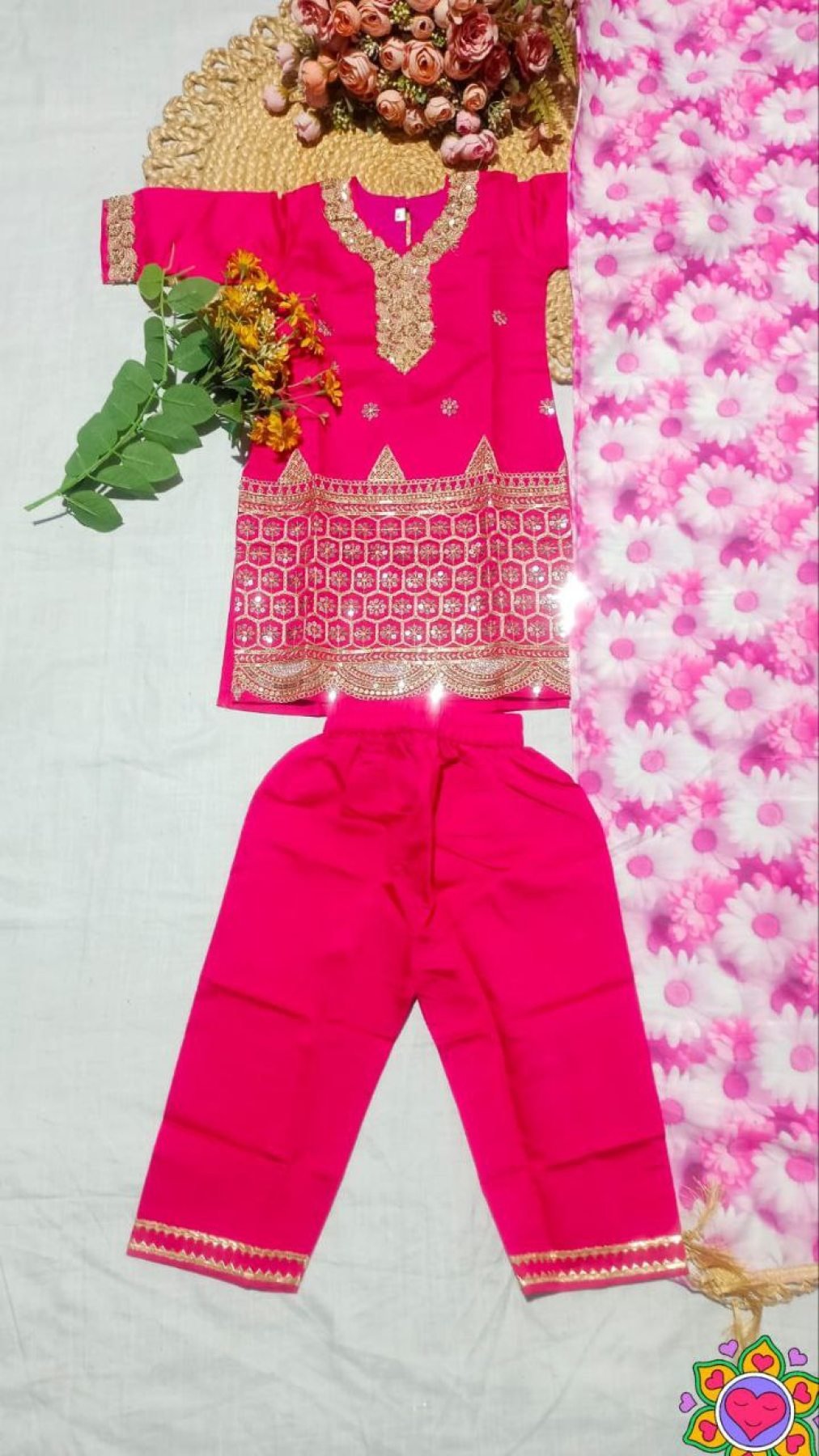 Elegant kids silk crepe suit set featuring floral embroidered kurta with pant and digital printed dupatta. Perfect for festive and party wear.