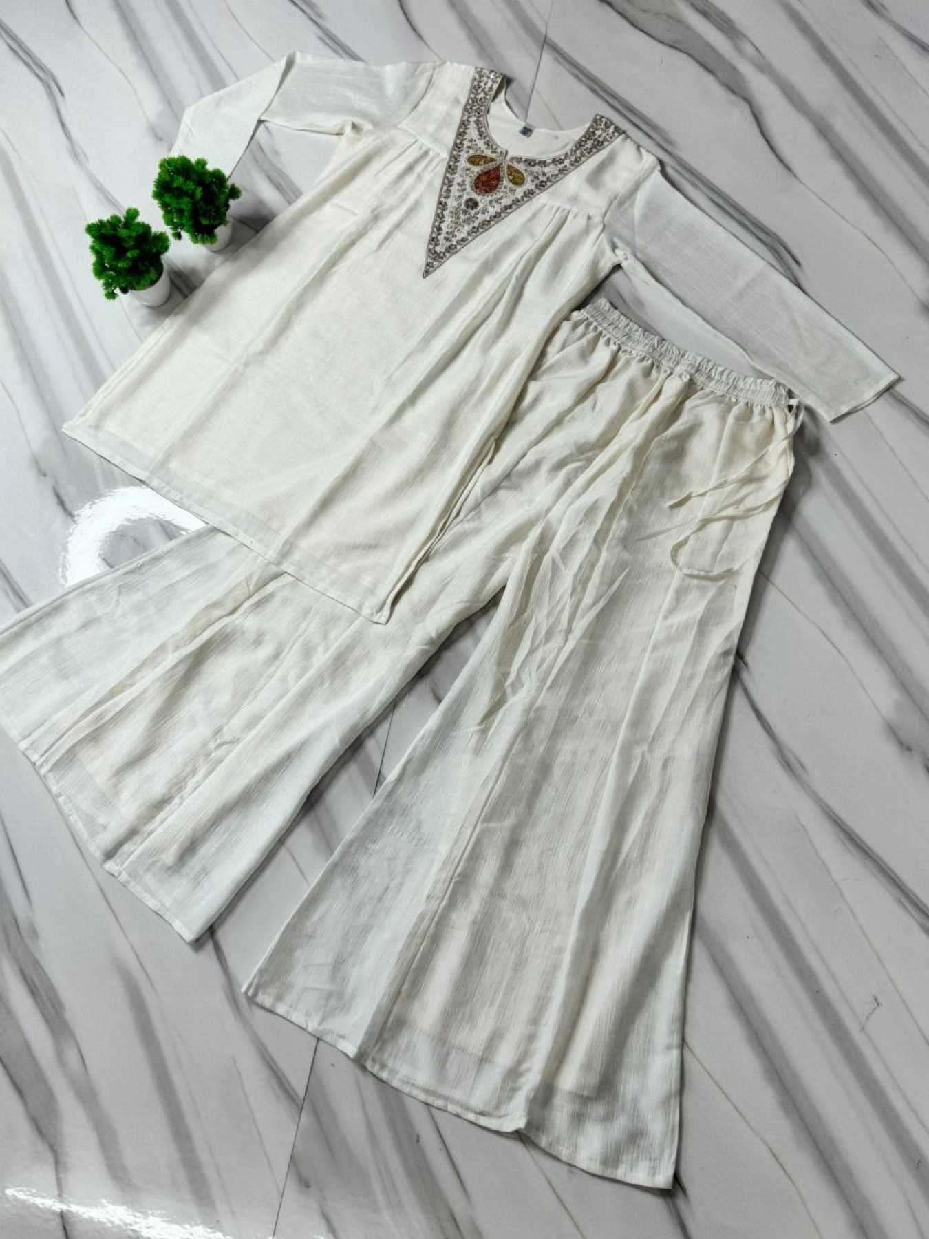 Elegant Vichitra silk top and palazzo set with thread and sequins embroidery. Designed with full flair palazzo and stylish V-neck pattern, perfect for festive, party, and ethnic wear.