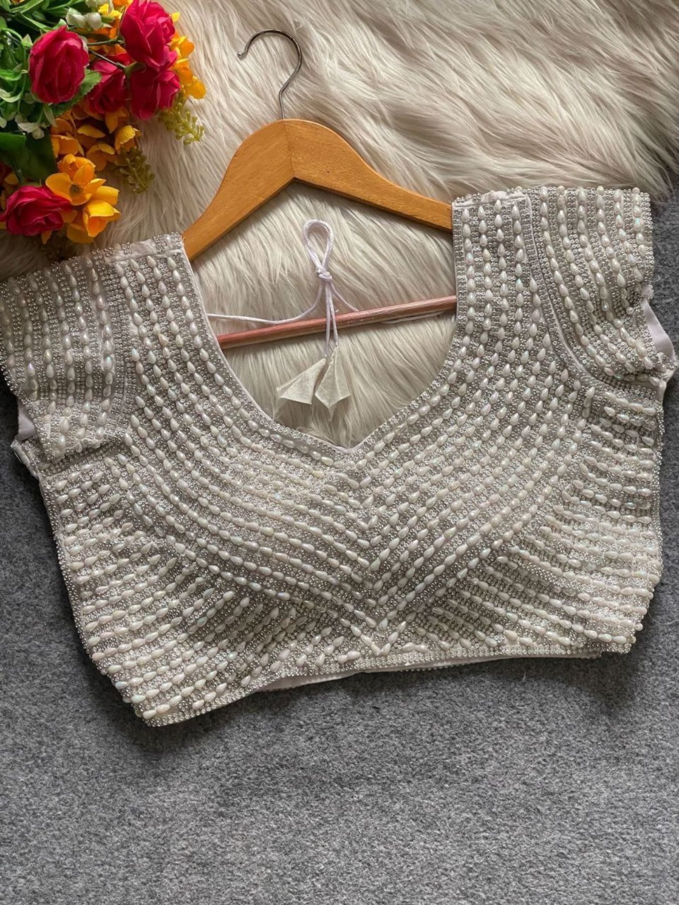 Artisanal White Silk Bridal Blouse with Rich Pearl Embroidery Majestic Party Wear