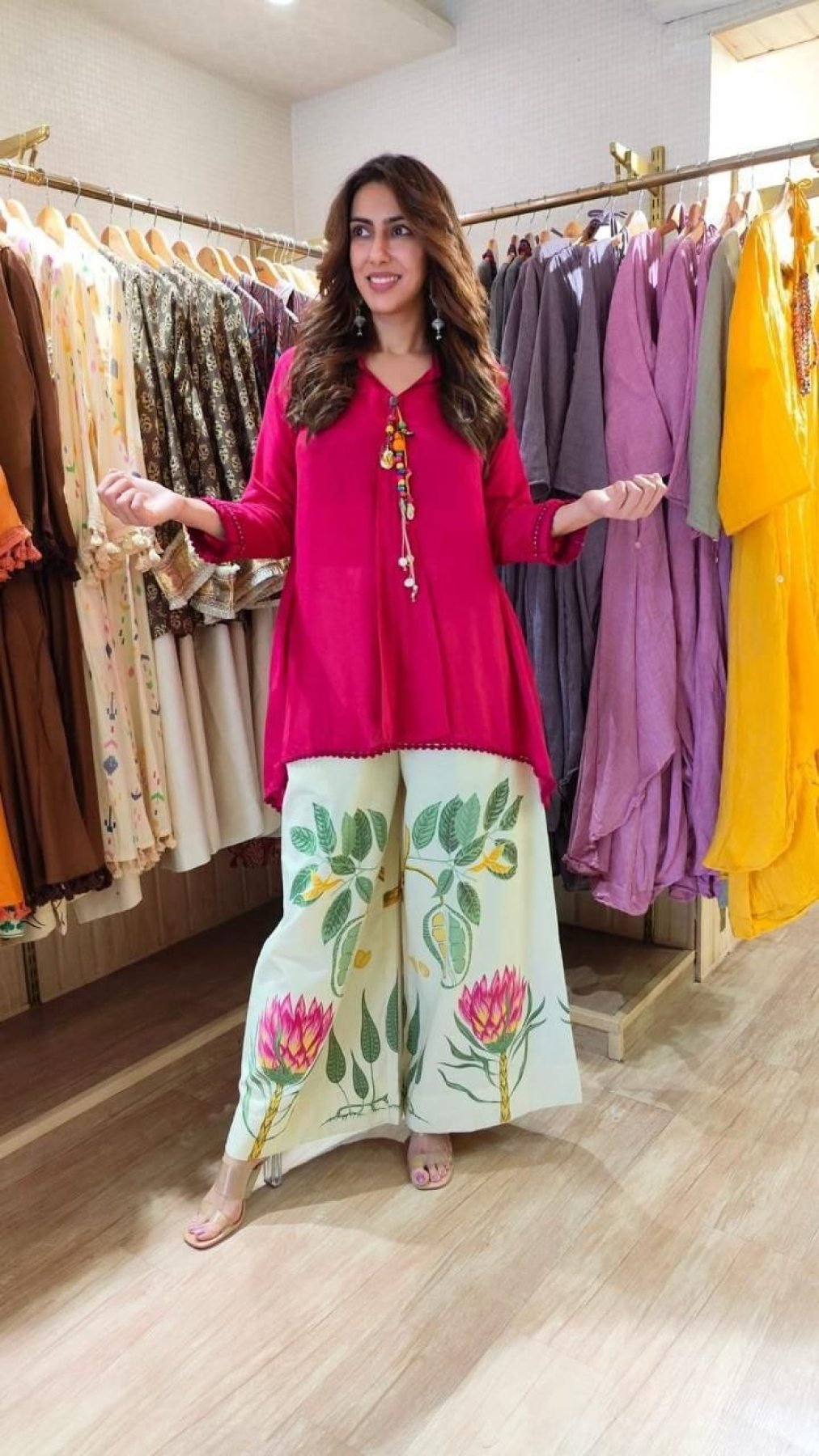 Smart premium cotton co-ord set with loose fit design, featuring sleeve embroidery, tassel detailing, and printed plazo. Perfect for summer wear, office, and casual outings with a stylish and comfortable look.