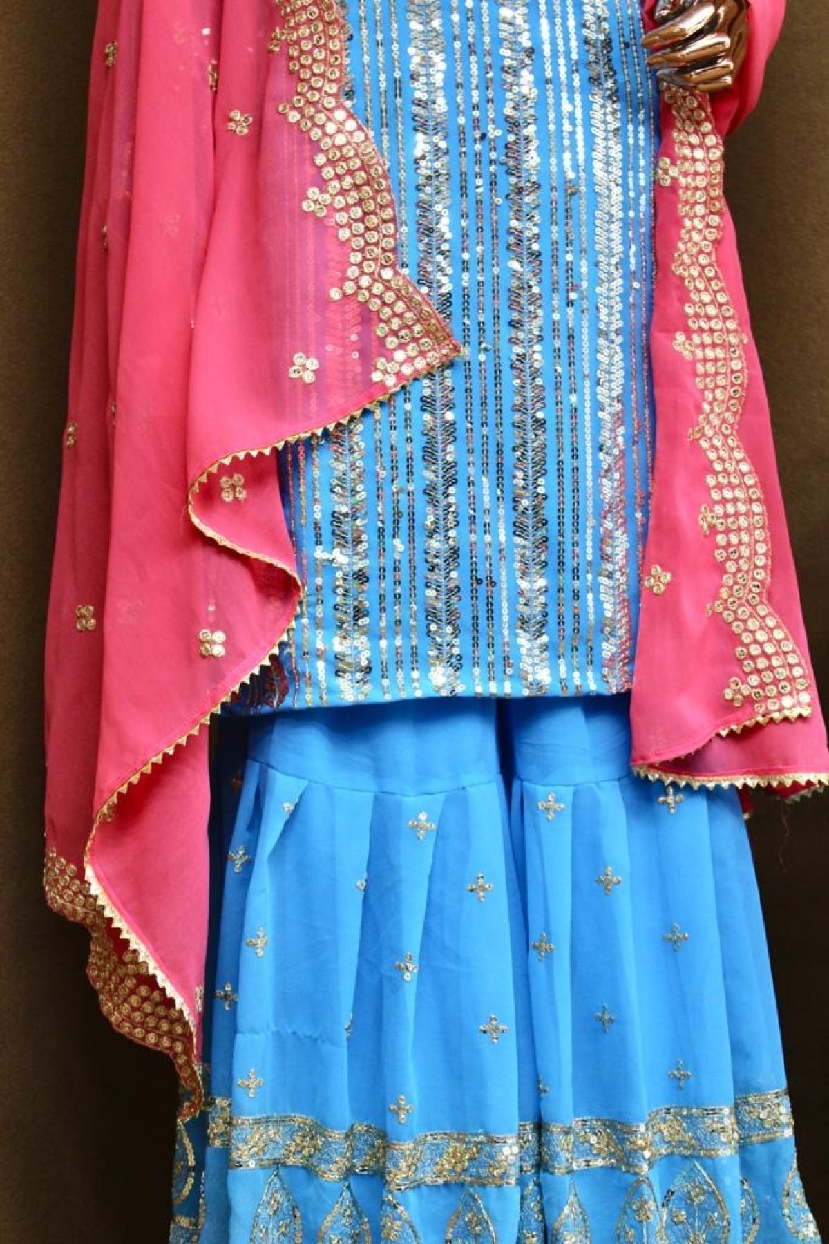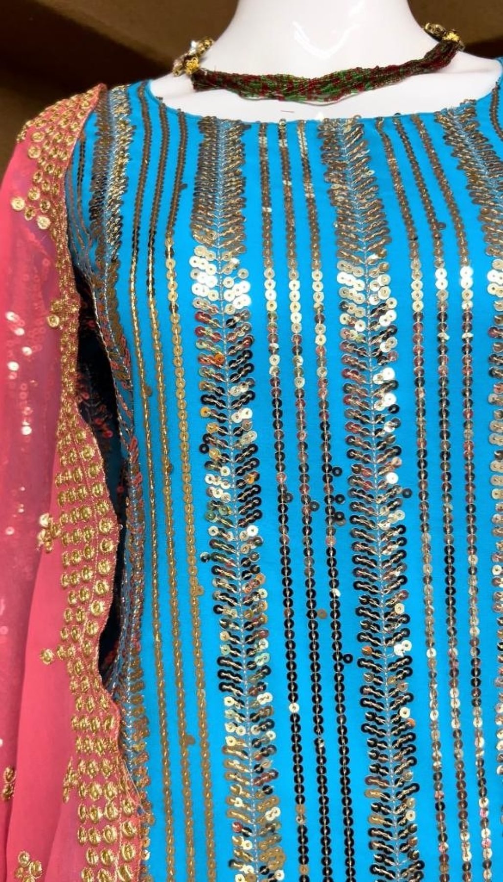 Sarara:- fox Georgette Silk Fabric With Single needle Zari Work and Sequence Embroidery Work With 3mtr Flair (Fully stitched)