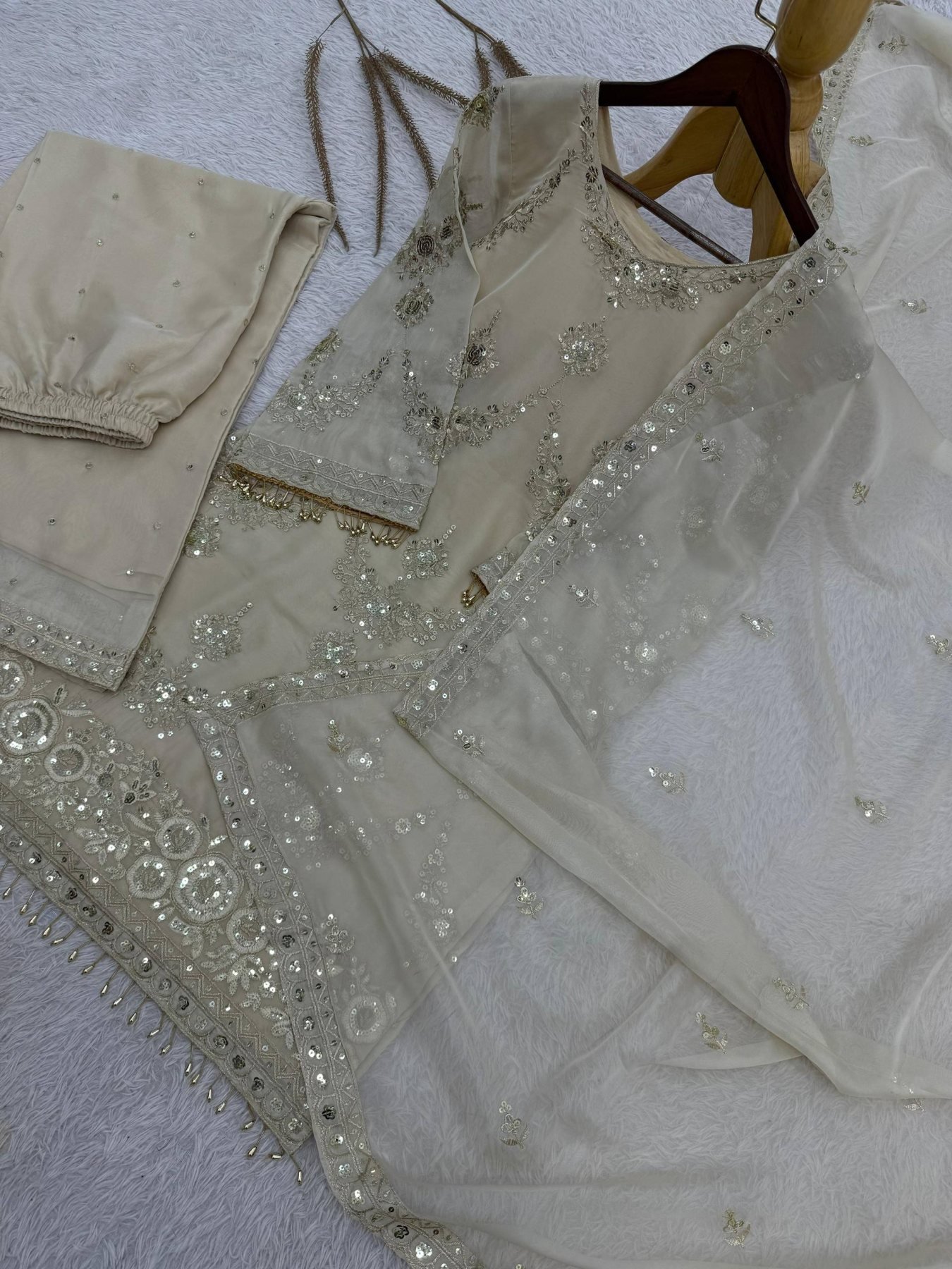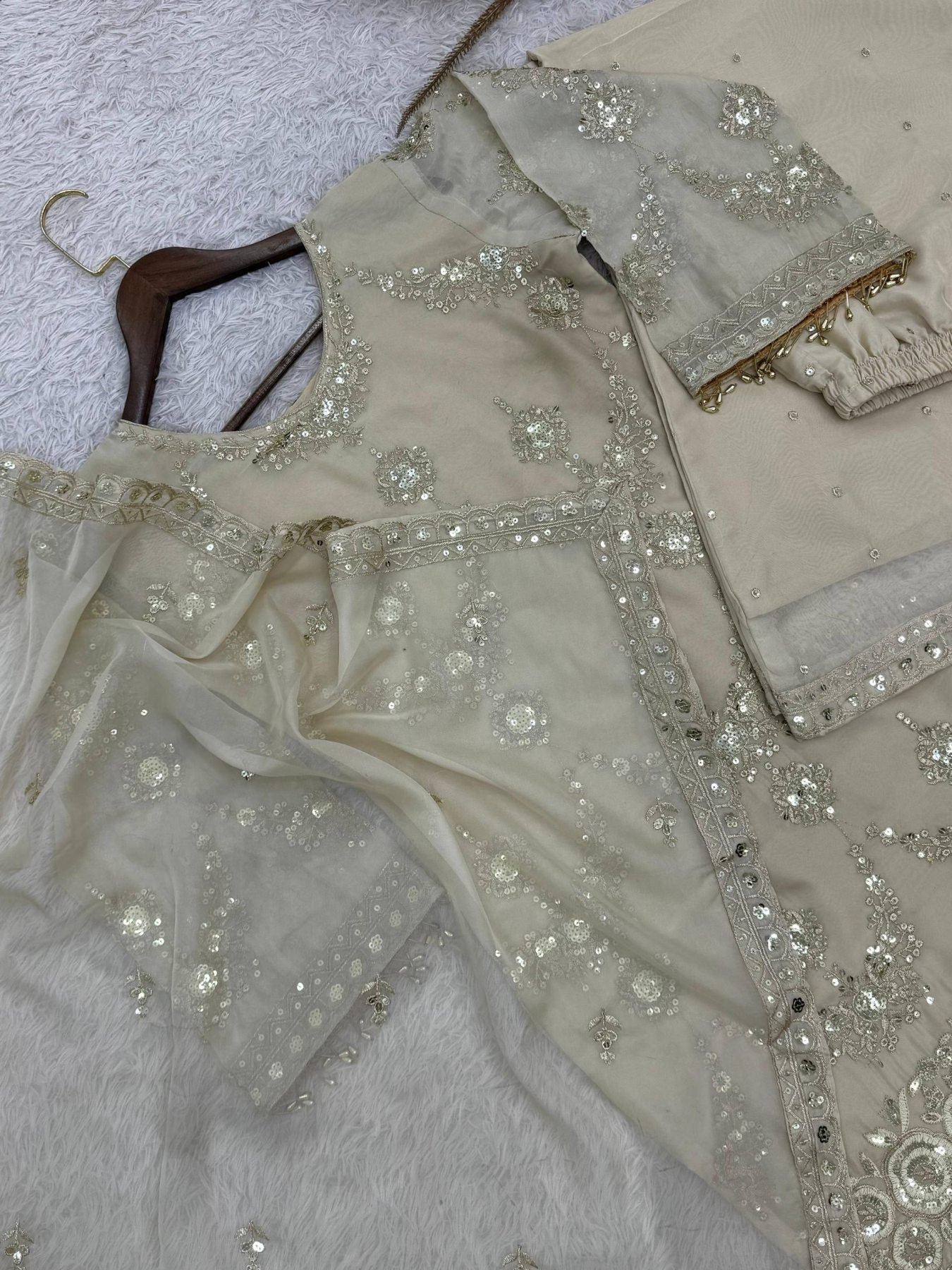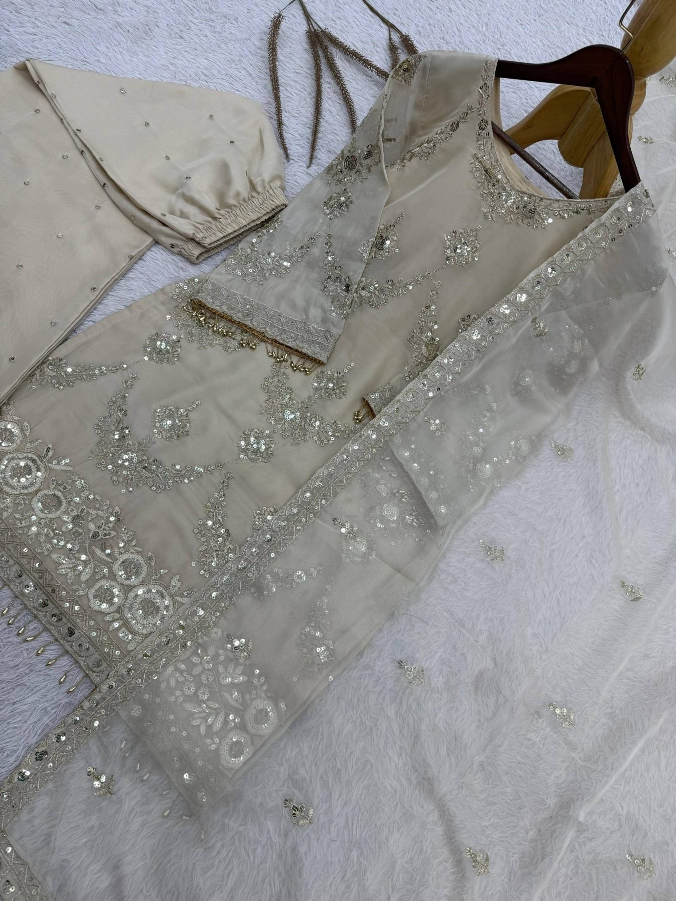 Presenting a stylish three-piece kurti, palazzo, and dupatta set in an elegant rich cream shade, crafted for a graceful festive look. Made from pure premium Kundan organza, this straight cut palazzo dress features beautiful embroidery sequence and cording work with ready-made lace detailing, making it a perfect choice for Eid celebrations at an attractive wholesale rate.