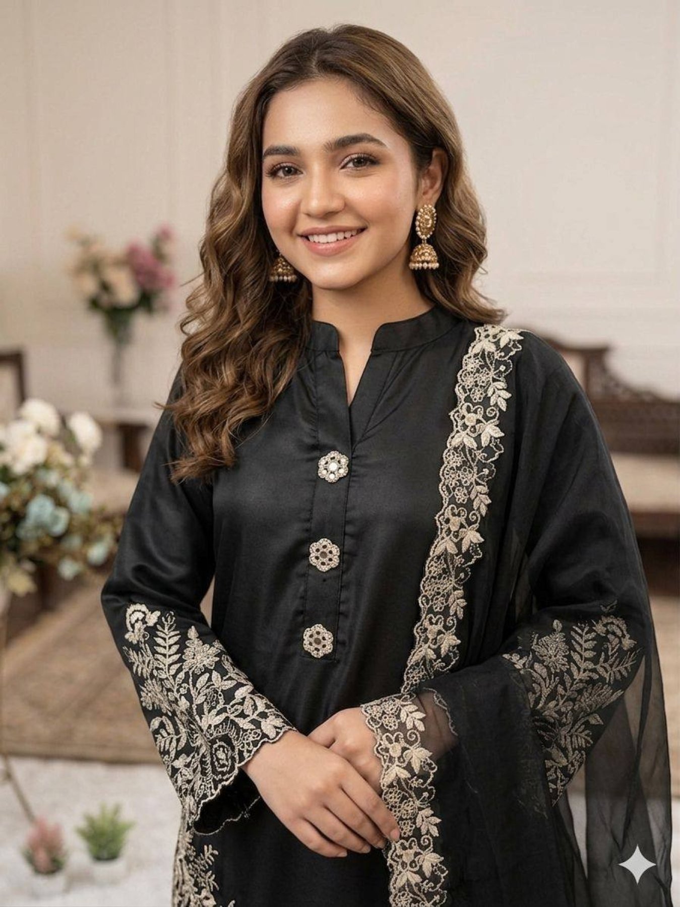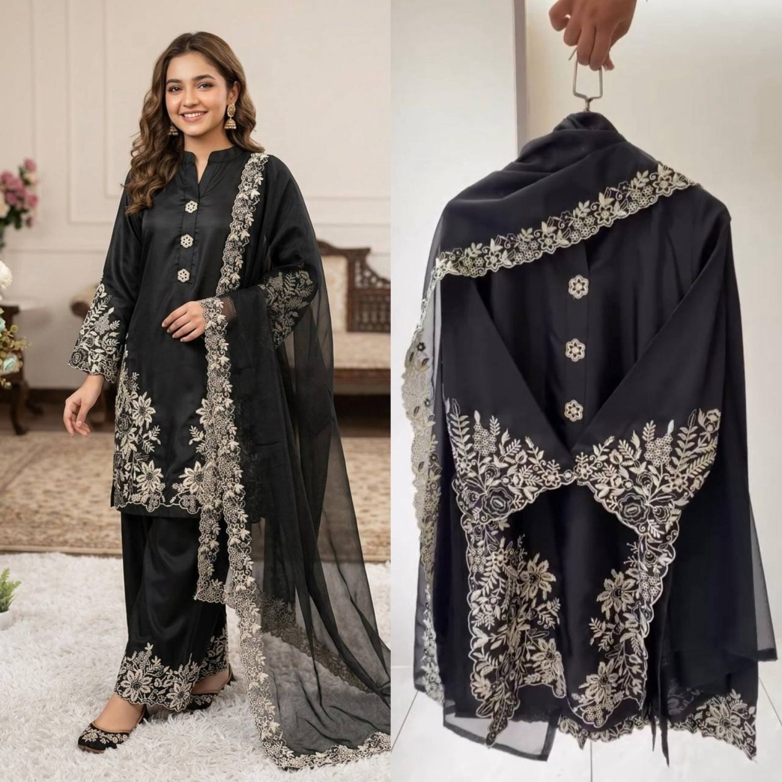 Authentic Black Pakistani Suit Set with Plazzo and Dupatta for Women