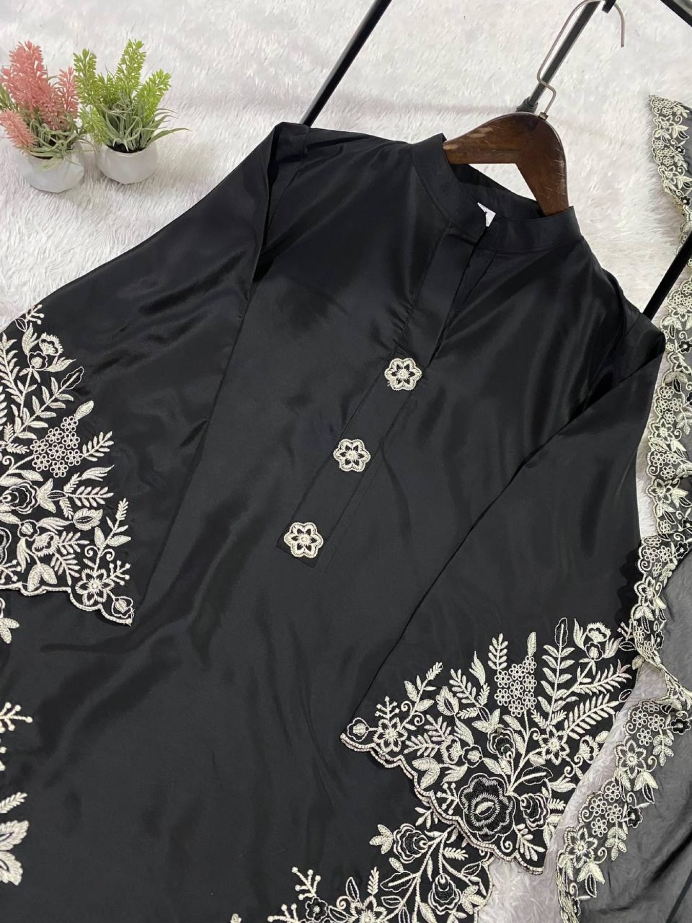 Elegant Pakistani-style crape silk suit set with beautiful embroidery work, paired with matching plazzo and soft organza dupatta. Perfect for festive wear, parties, and wedding occasions.