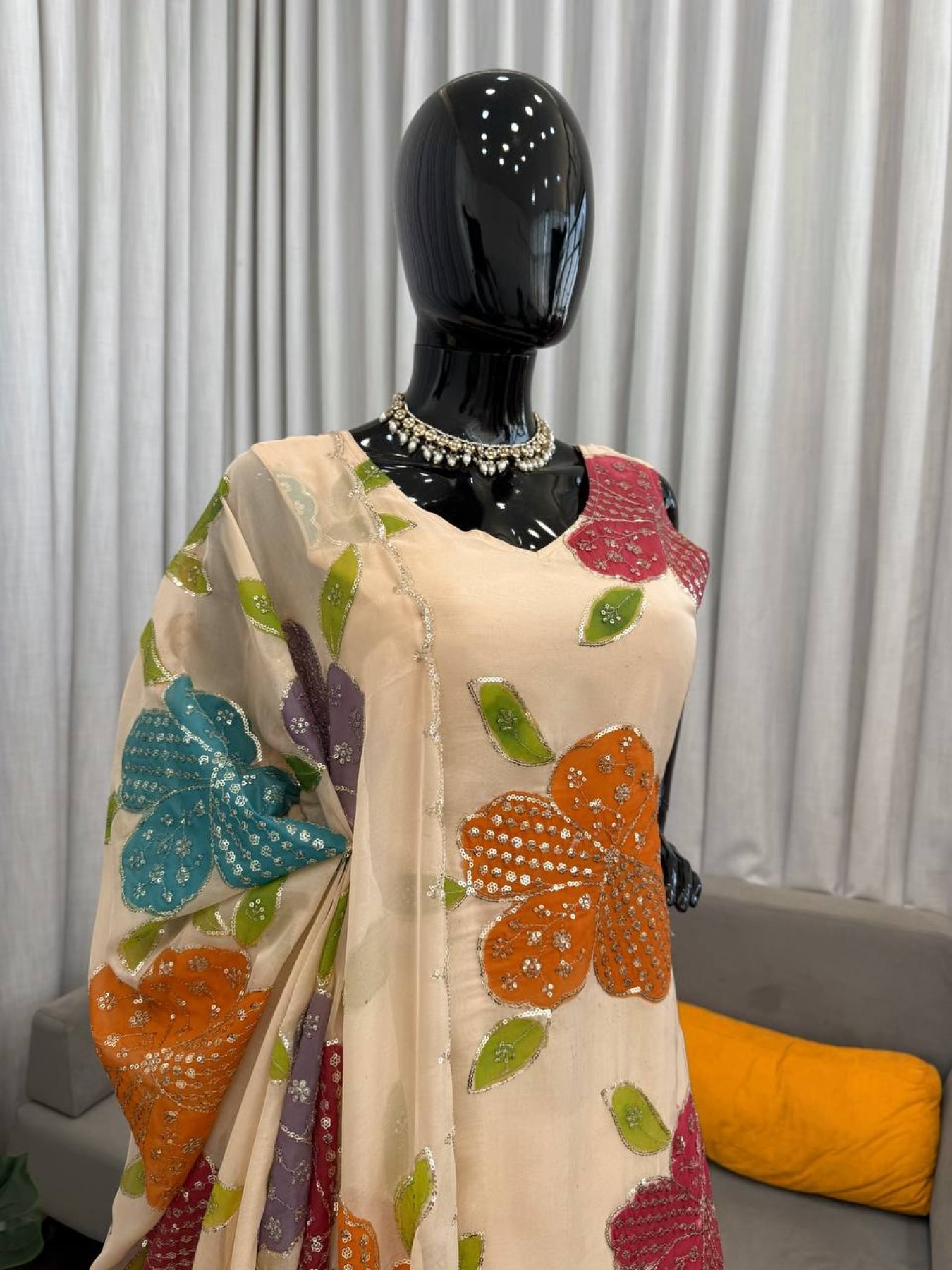 Authentic Organza Silk Cream Kurti Palazzo Set with Sequins Work for Party Wear