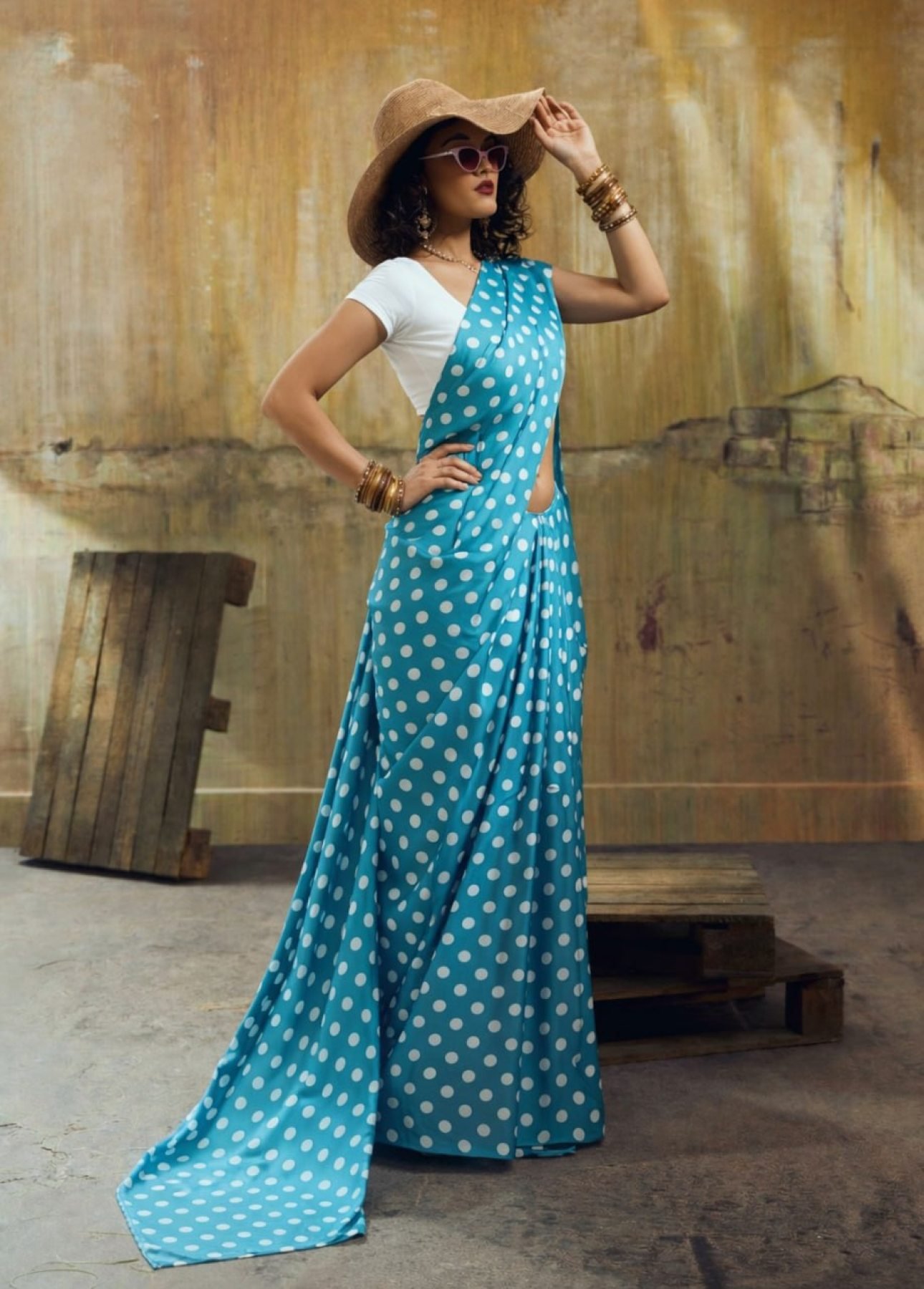 Stylish satin saree crafted in heavy Japan satin featuring elegant polka dot print all over. Paired with a matching mono banglory blouse, this lightweight and trendy saree is perfect for casual wear, parties, and festive occasions.