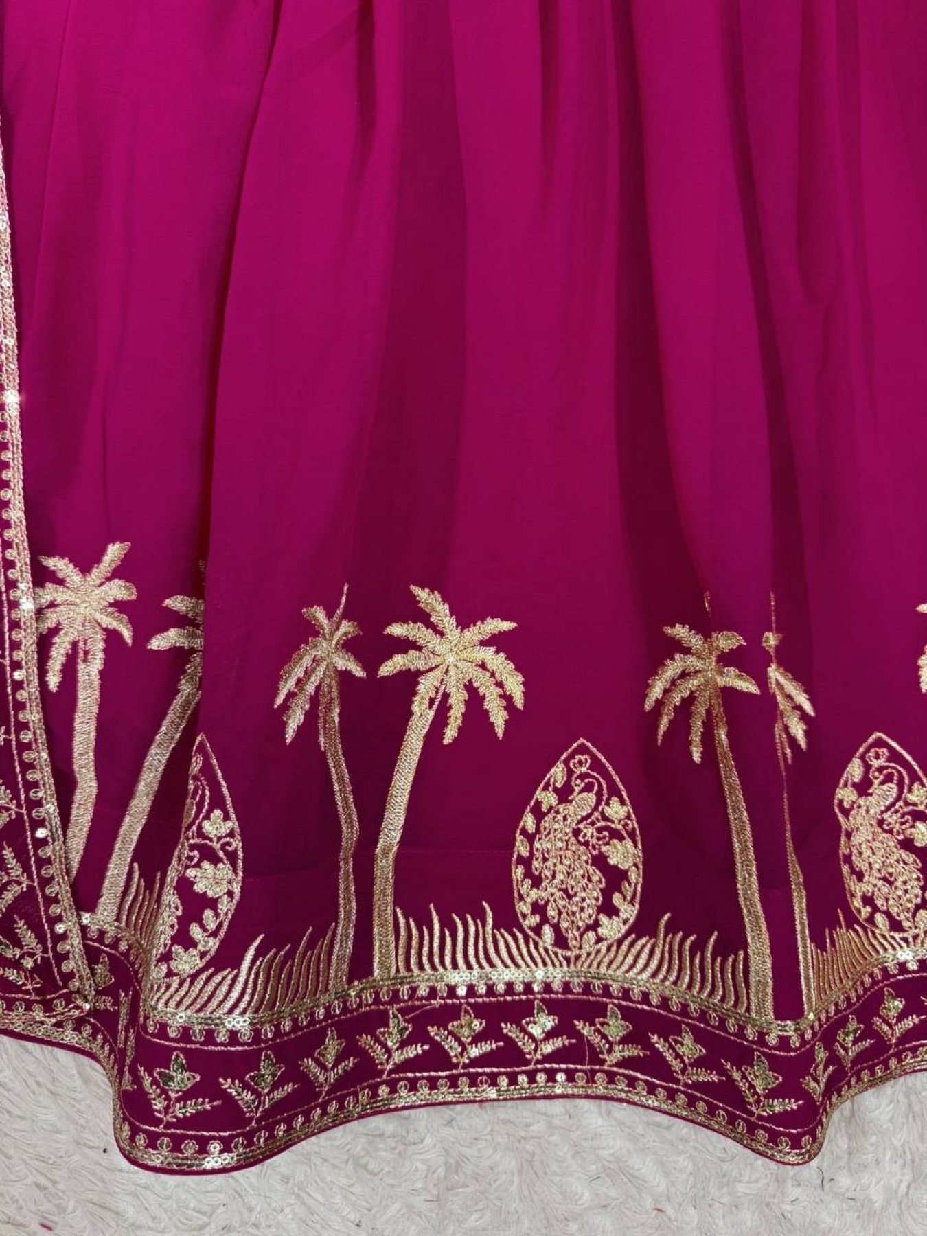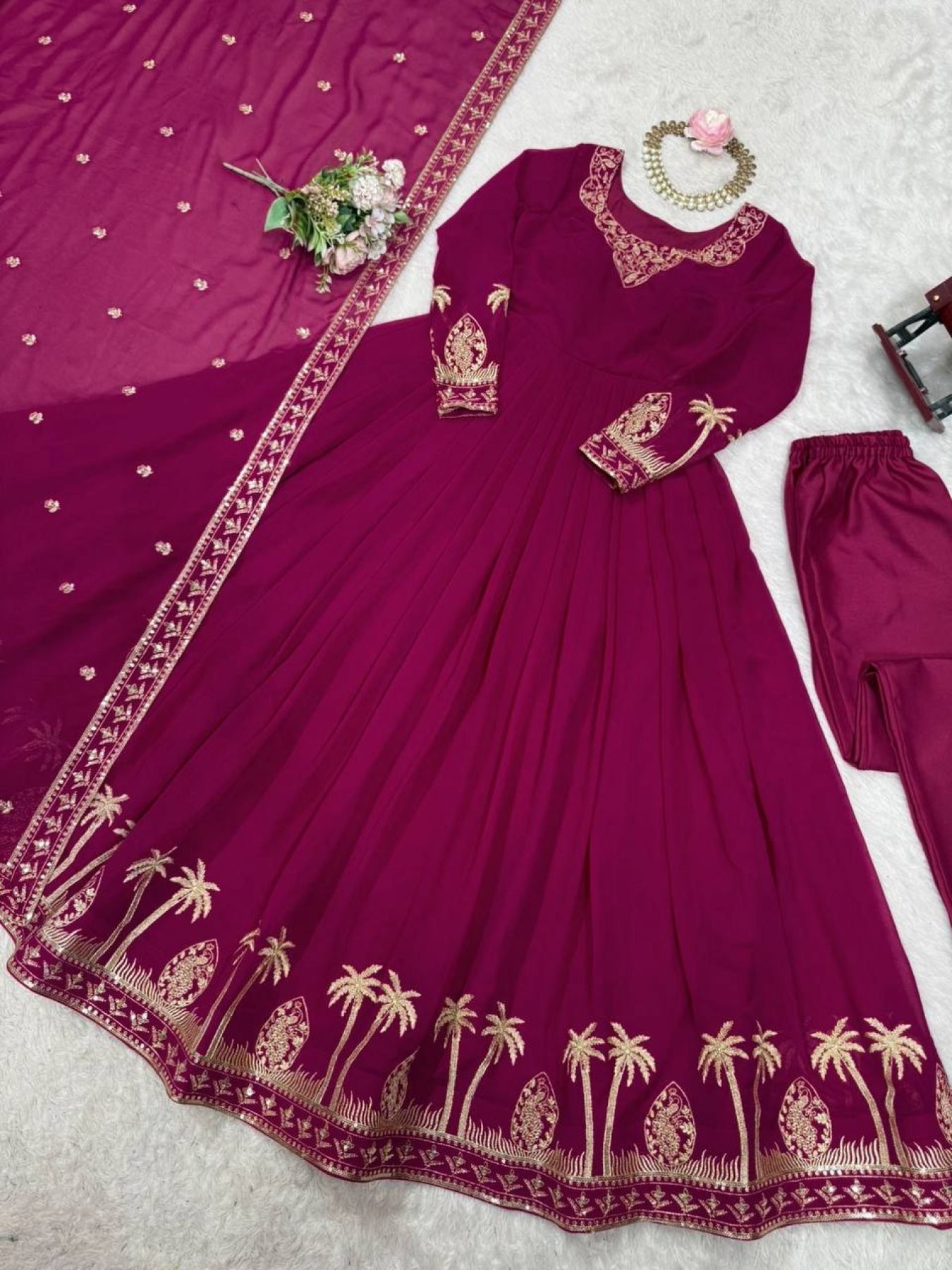 Step into a trendy and viral festive look with this elegant faux georgette gown set featuring beautiful thread and sequence work on both front and back for a rich designer finish. Paired with a comfortable pant and a matching dupatta, this outfit offers a perfect blend of grace and modern ethnic style, ideal for parties, festive occasions, and special celebrations.
