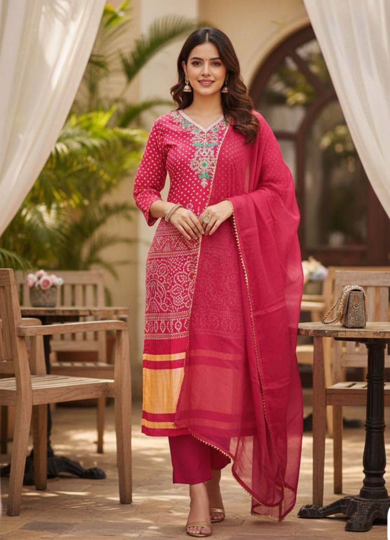 This rani pink and maroon bandhani print salwar kameez set is crafted in soft chinon fabric with elegant thread embroidery.