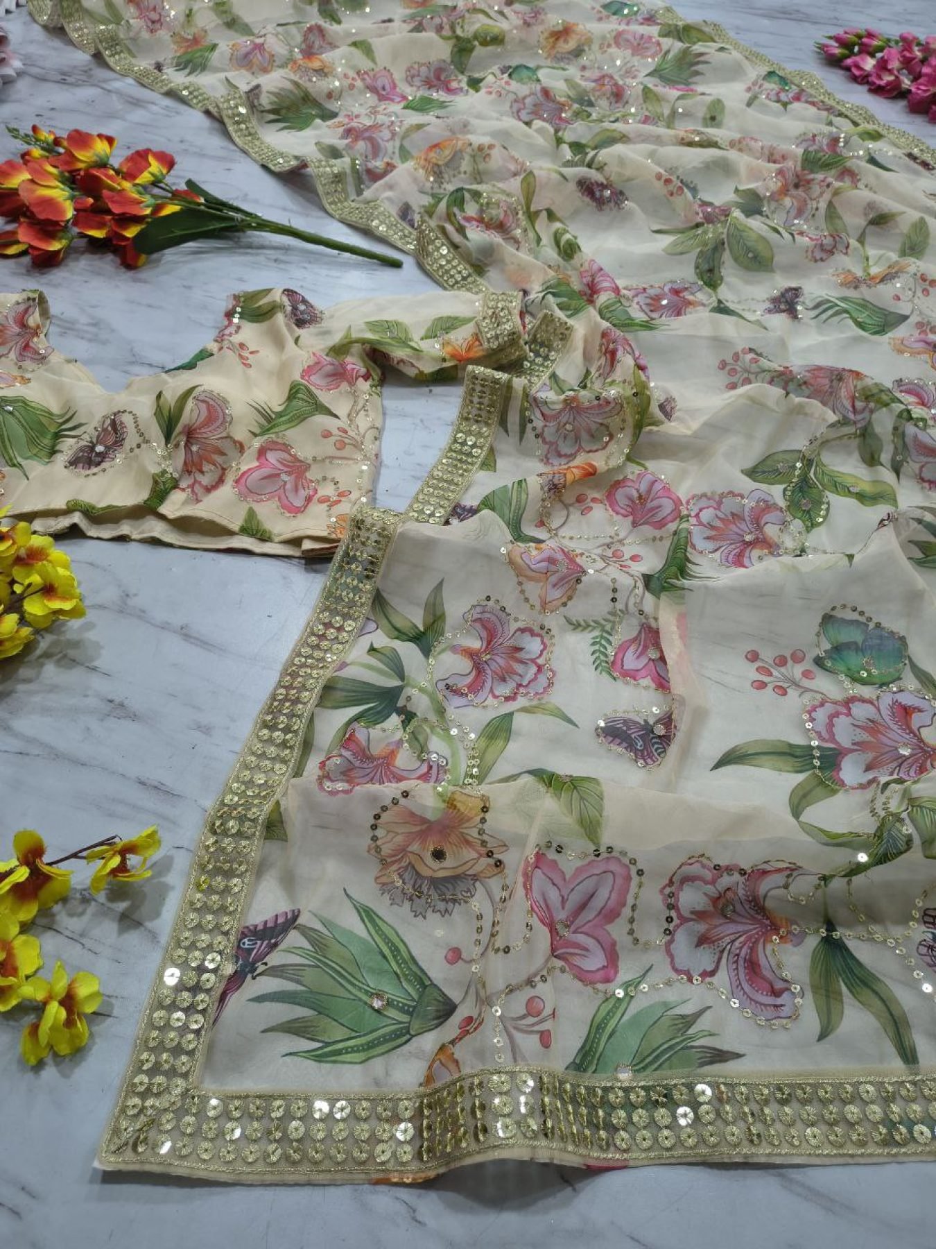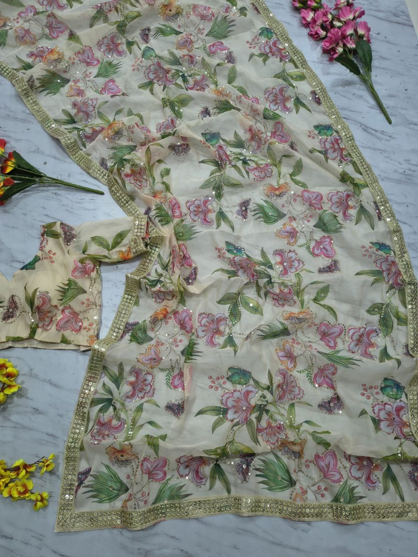 Premium tabby silk saree featuring elegant print with sequins and foil mirror work, enhanced with designer lace border. Comes with matching blouse, perfect for festive wear, parties, and special occasions.
