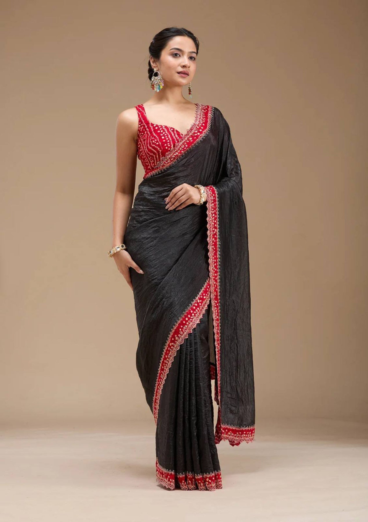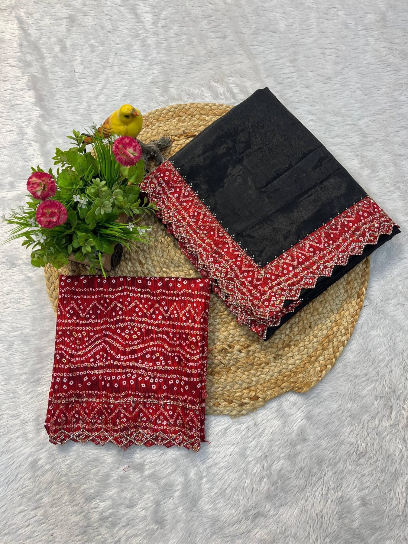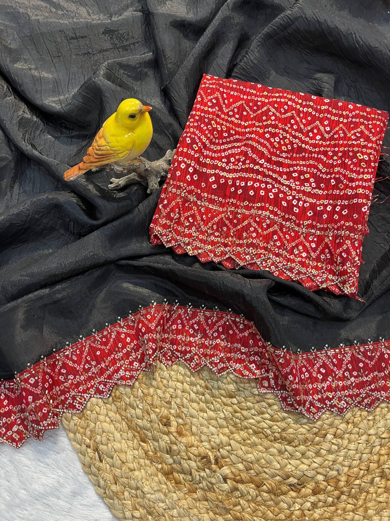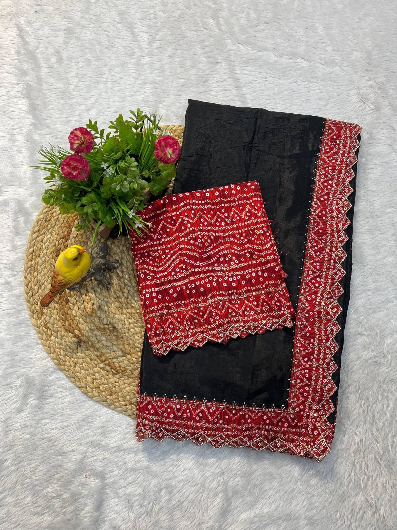 Black Bandhej Saree with Hand Embellished Beads and Stones Silk Satin Blouse Piece
