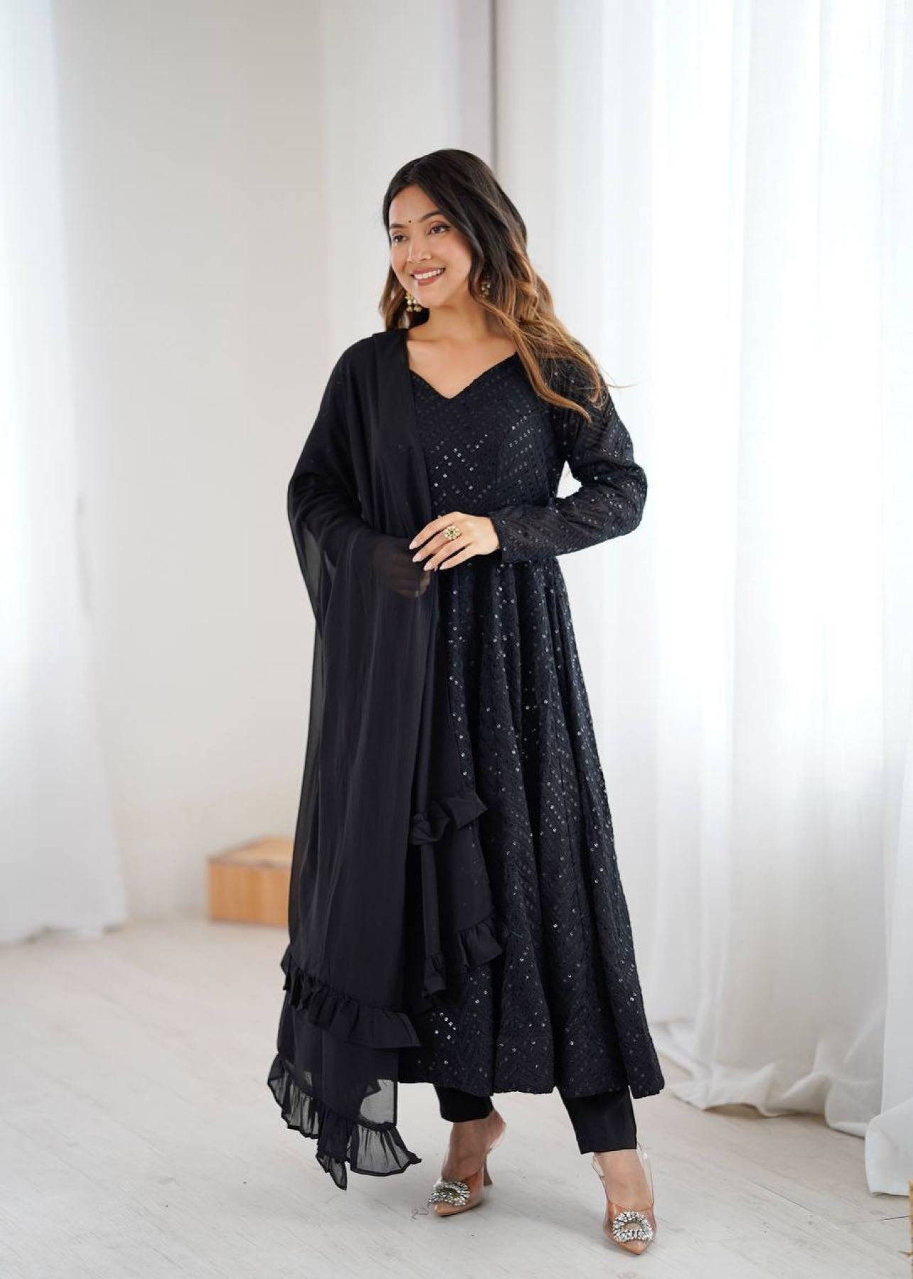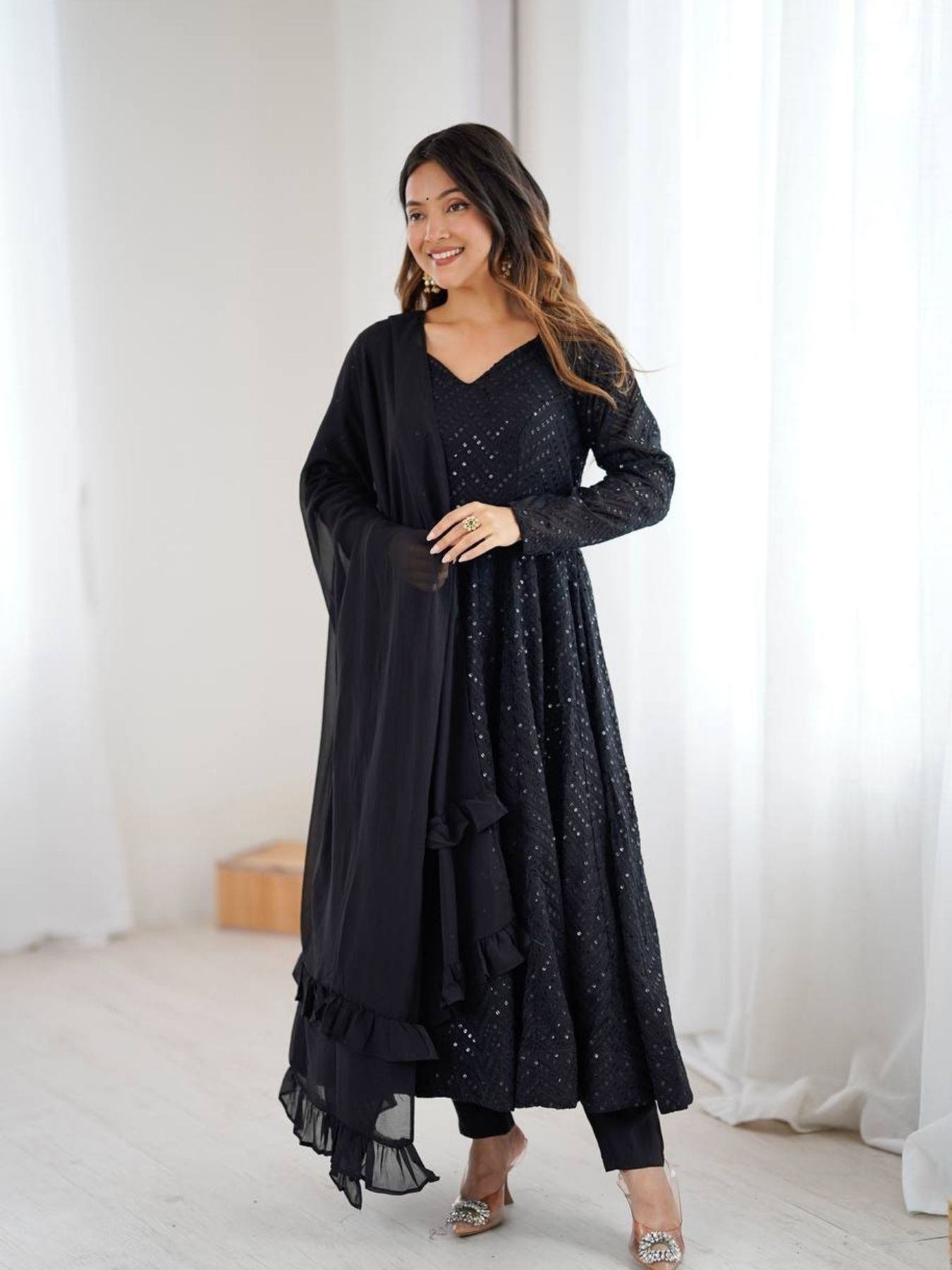 Turn heads with this heavy Fox Georgette Anarkali gown, styled with Lucknowi sequence embroidery, padded design, and a 4-meter flared kali-cut silhouette. Comes with a ruffle-style dupatta and free-size stitched pant for a complete luxury look. Perfect for weddings, parties, and festive occasions.