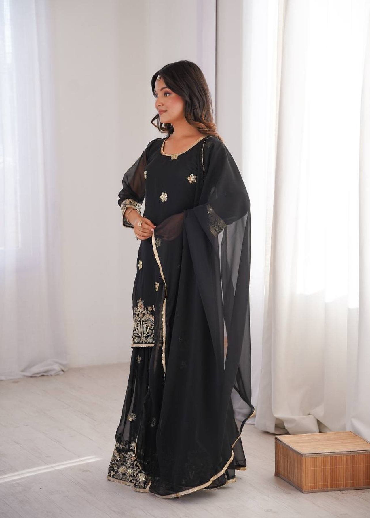 Embrace the allure of black with this stunning designer Sharara pair crafted from premium georgette fabric and adorned with fine sequence embroidery work. The fully stitched top features a beautiful dori-tie back and a comfortable micro cotton inner lining. Paired with a matching georgette sharara and 2.3-meter dupatta, this set radiates elegance — perfect for festive gatherings, weddings, and evening events.