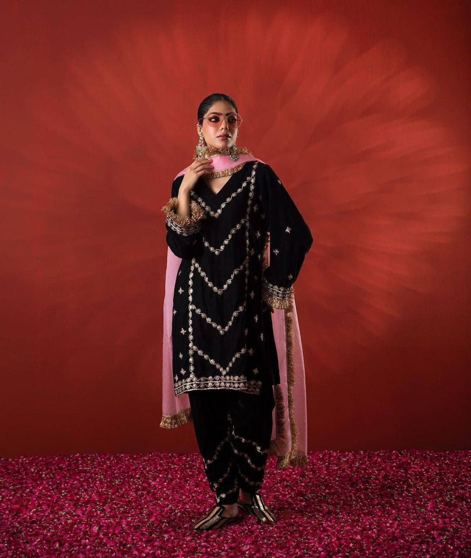 Black Heavy Velvet Embroidered Top Palazzo Suit