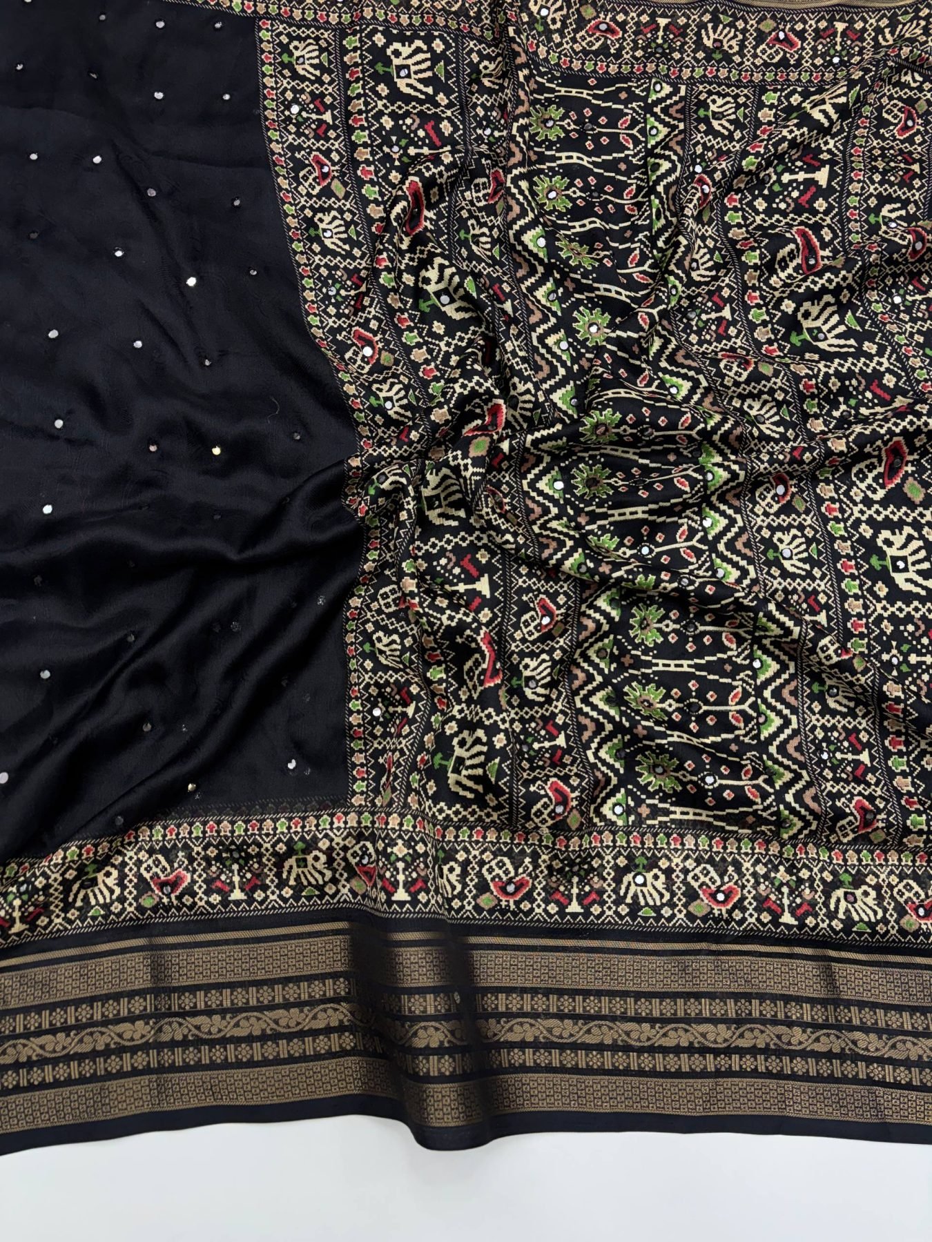 Black Marshmallow Silk Printed Saree with Aari Mirror Work for Festive Wear