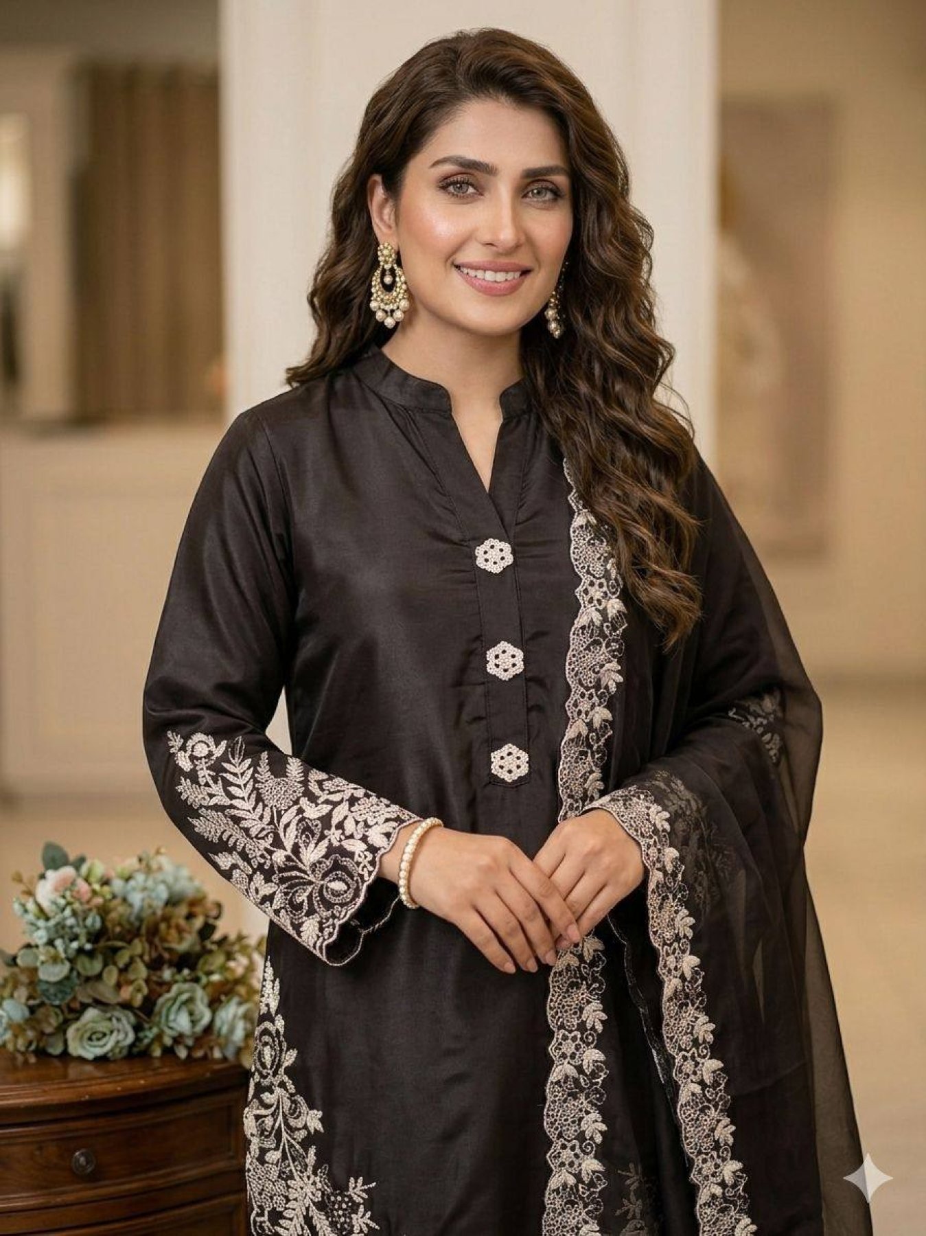 Black Pakistani-Style Embroidered Suit Set With Dupatta for Special Occasions