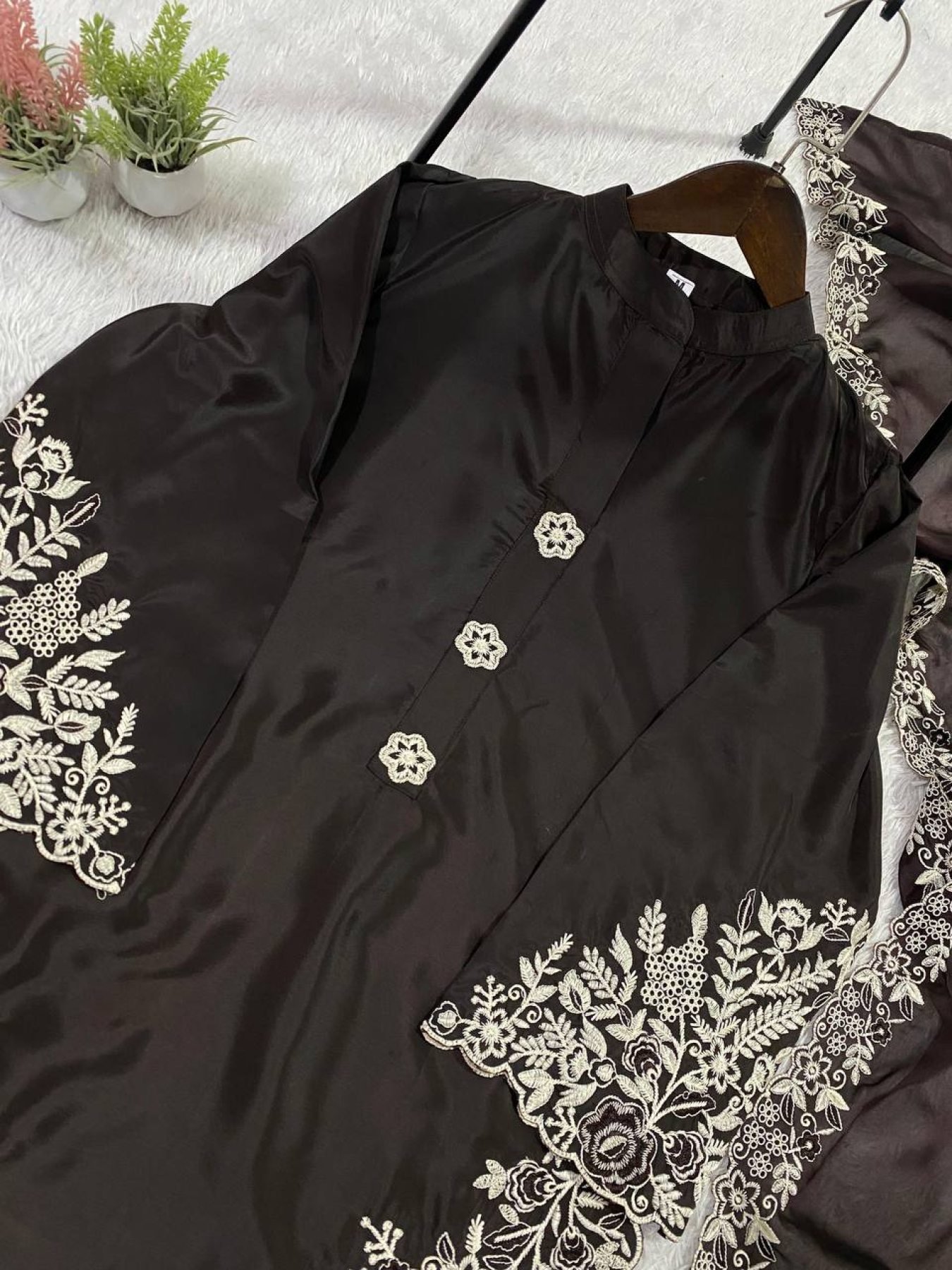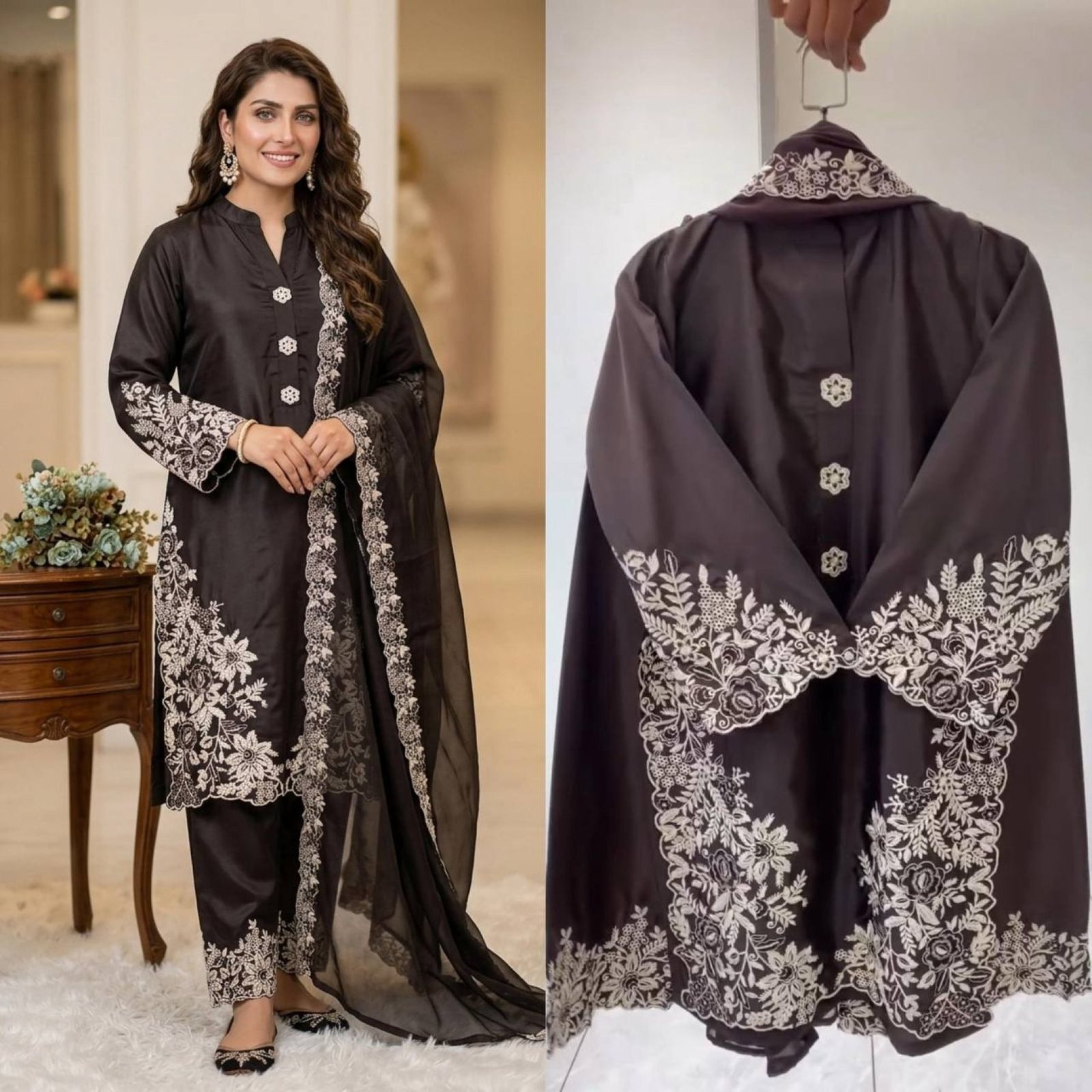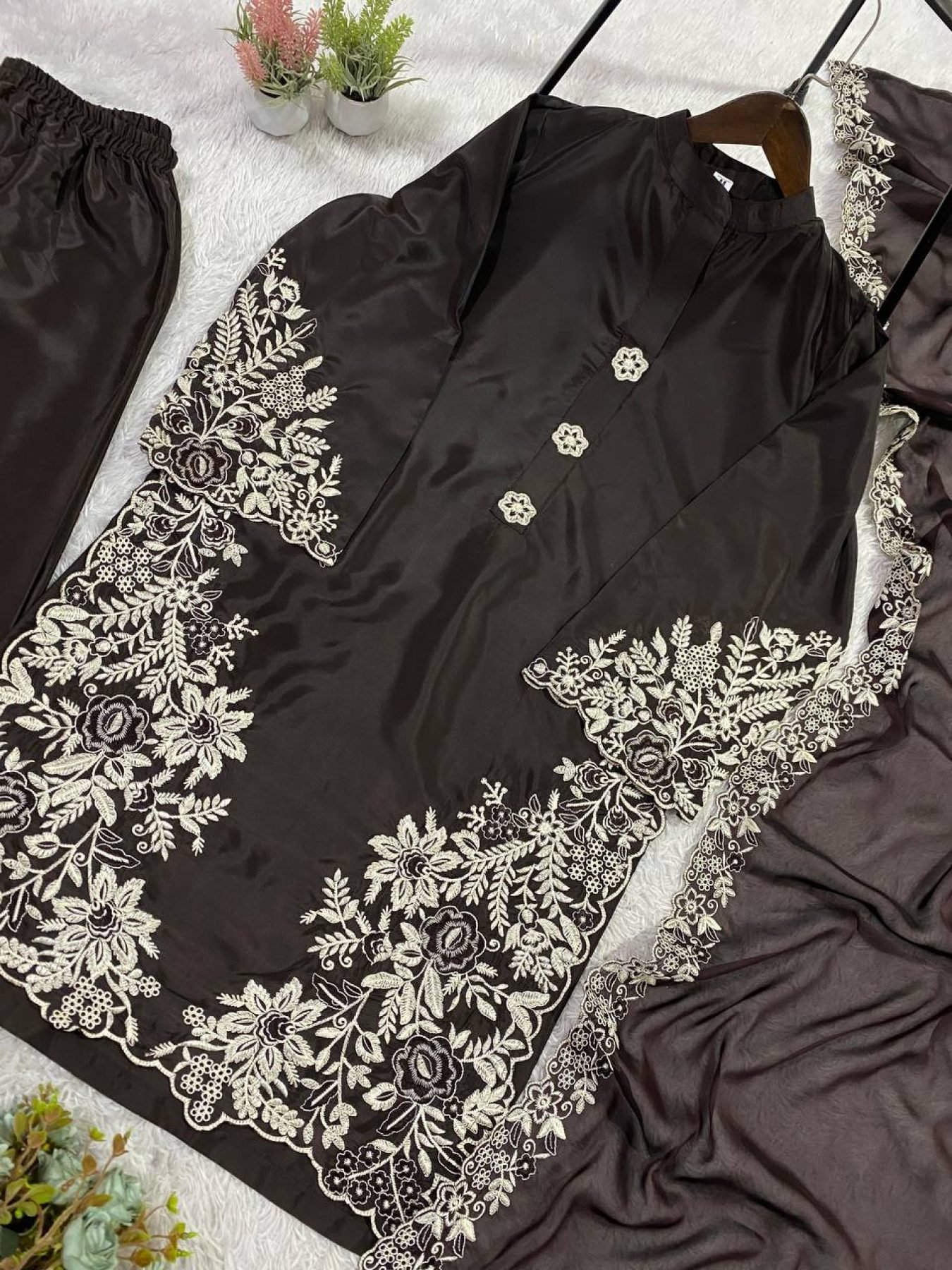 Elegant Pakistani-style crape silk suit set with beautiful embroidery work, paired with matching plazzo and soft organza dupatta. Perfect for festive wear, parties, and wedding occasions.