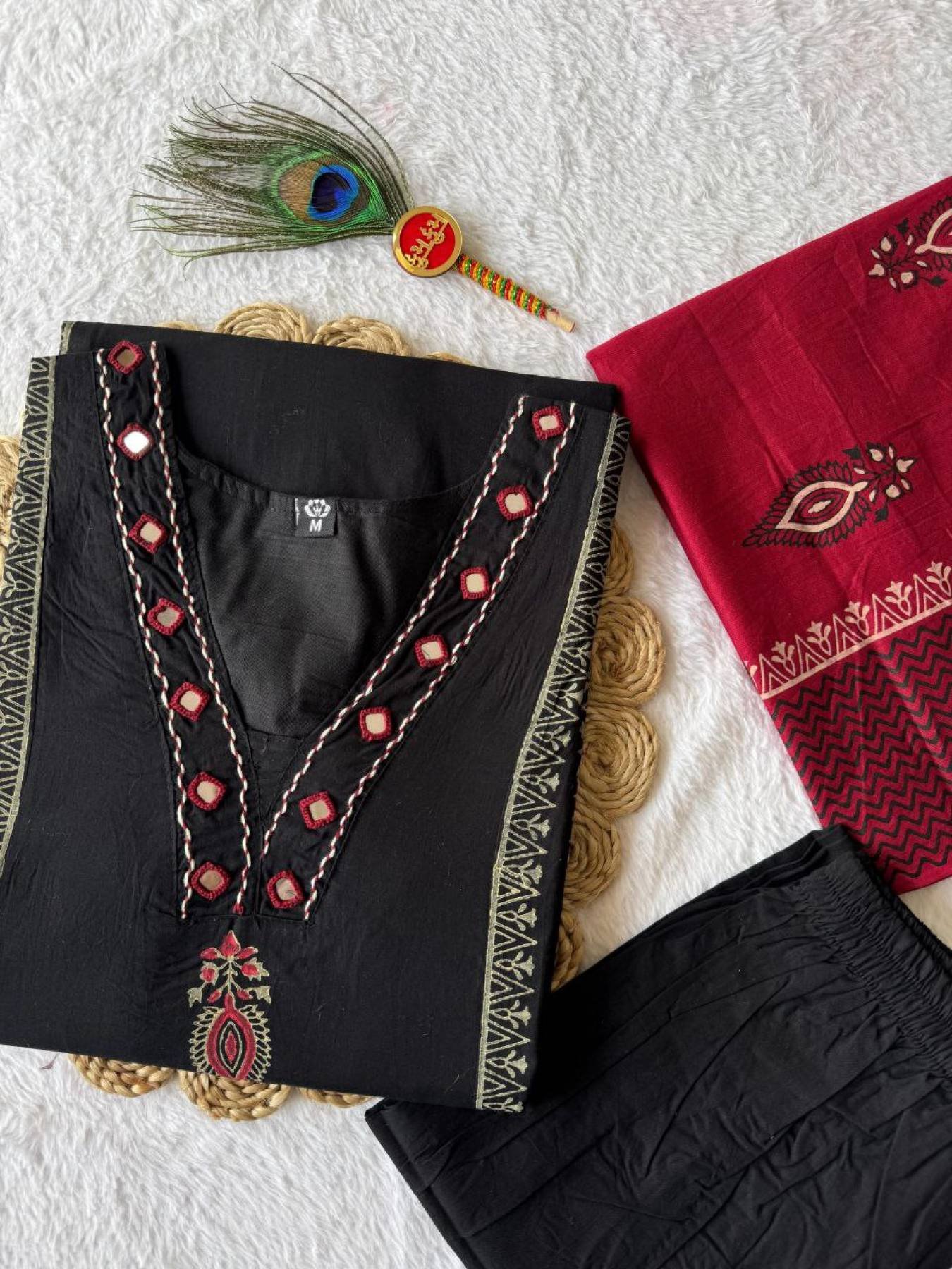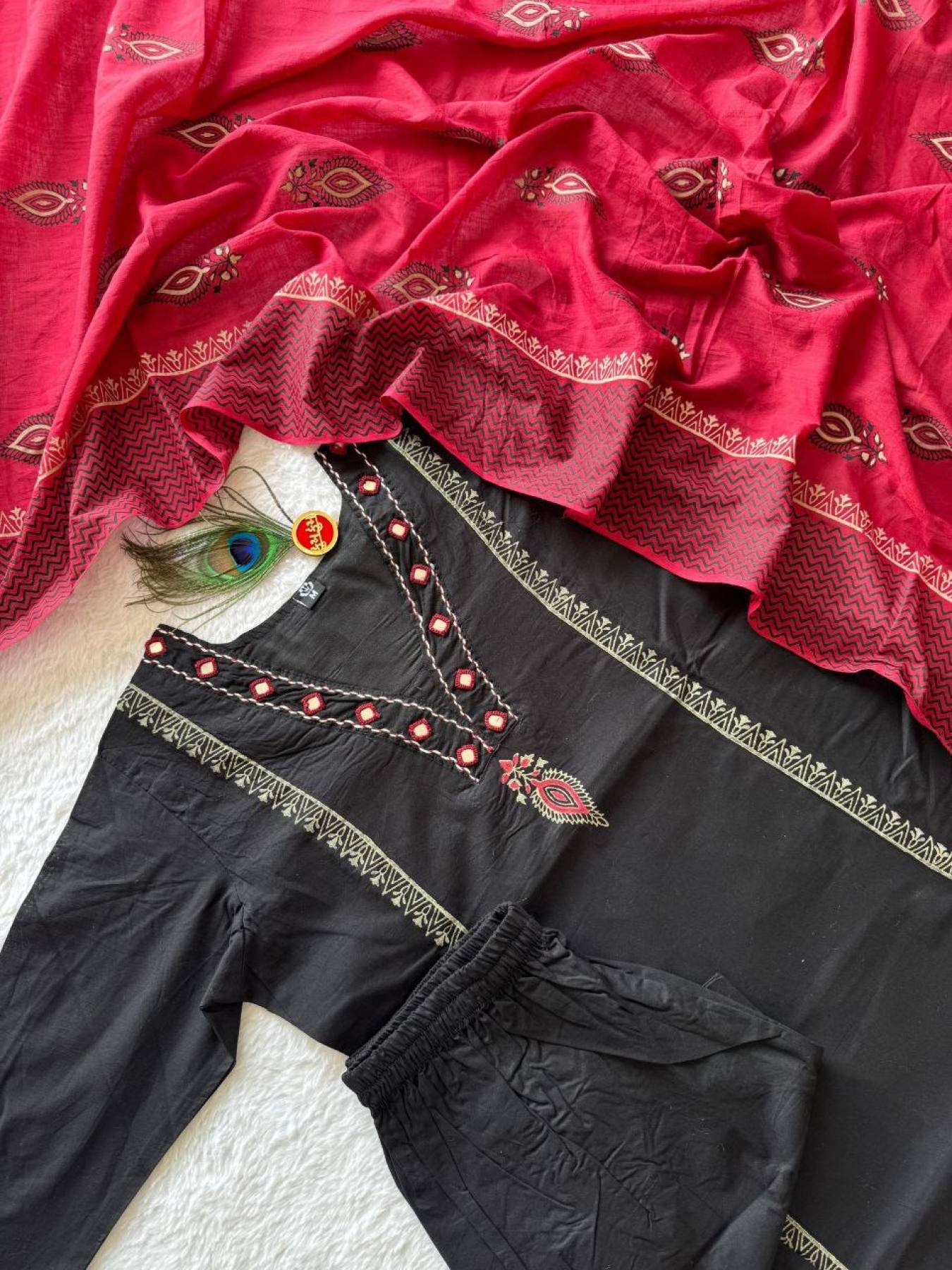 Experience timeless elegance with this Black Pure Cotton Kurti Pant Dupatta Set, blending traditional artistry with modern comfort.