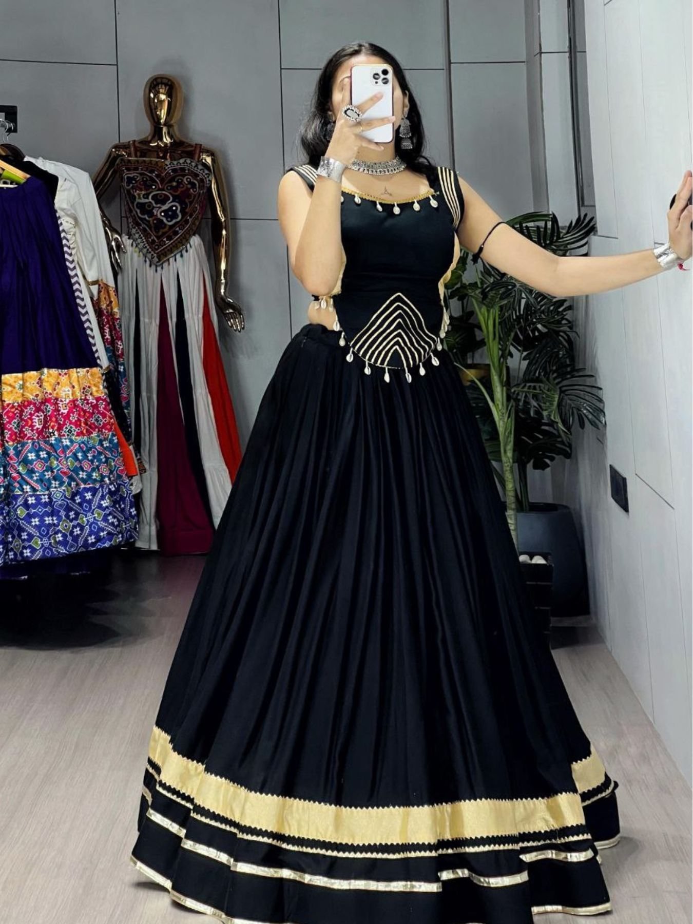 Black Pure Rayon Cotton Gamthi Lehenga Choli with Real Mirror and Fancy Patti for Garba Outfits
