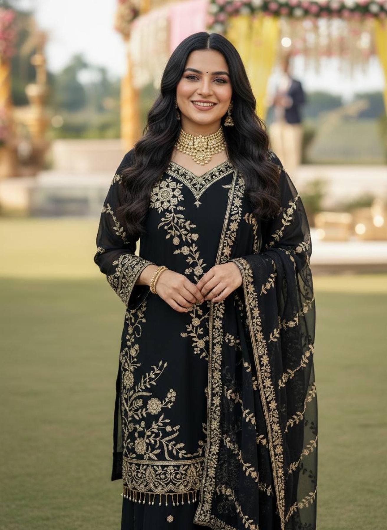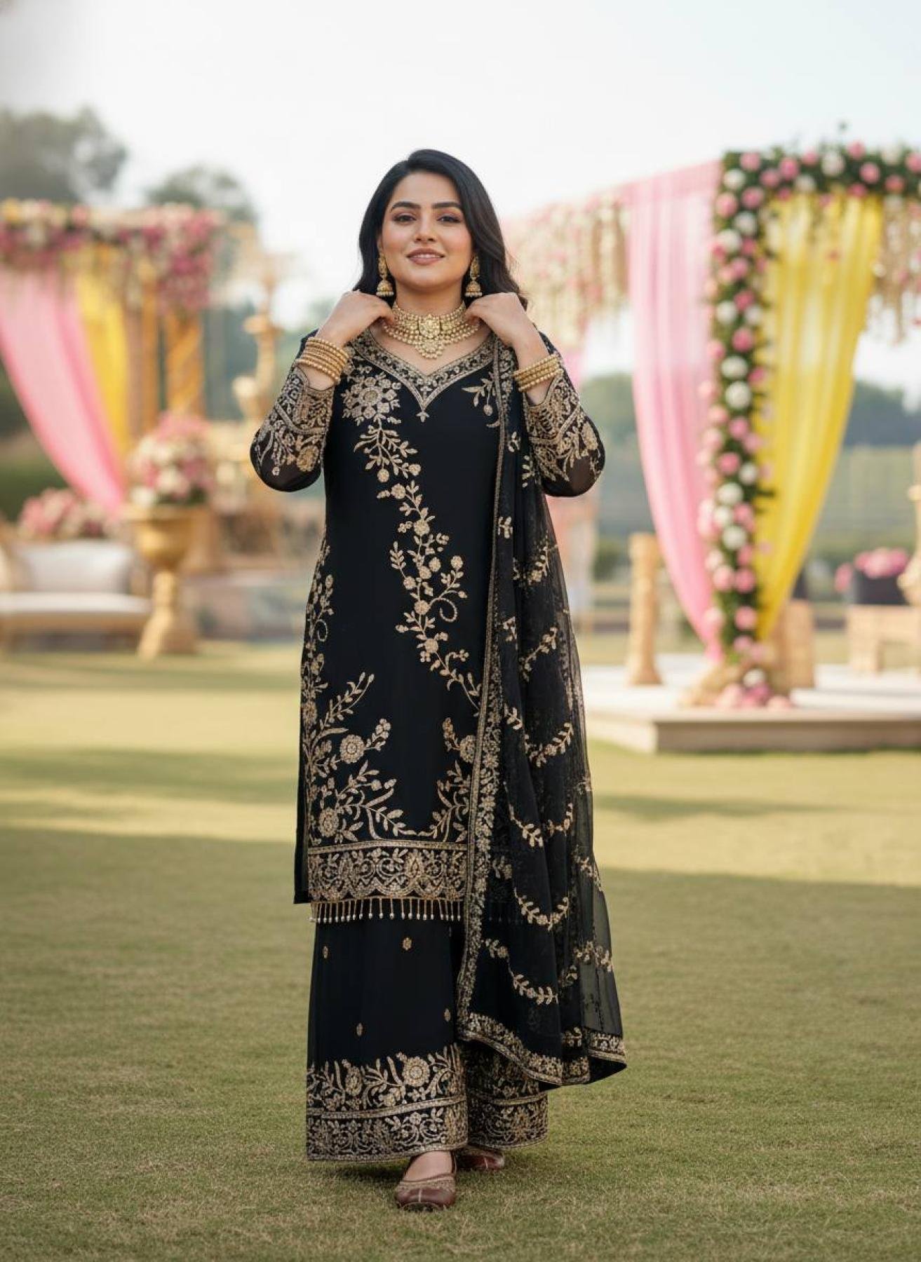 Step into timeless elegance with this Black Semi Faux Georgette Readymade Suit Set, a perfect blend of sophistication and traditional artistry.