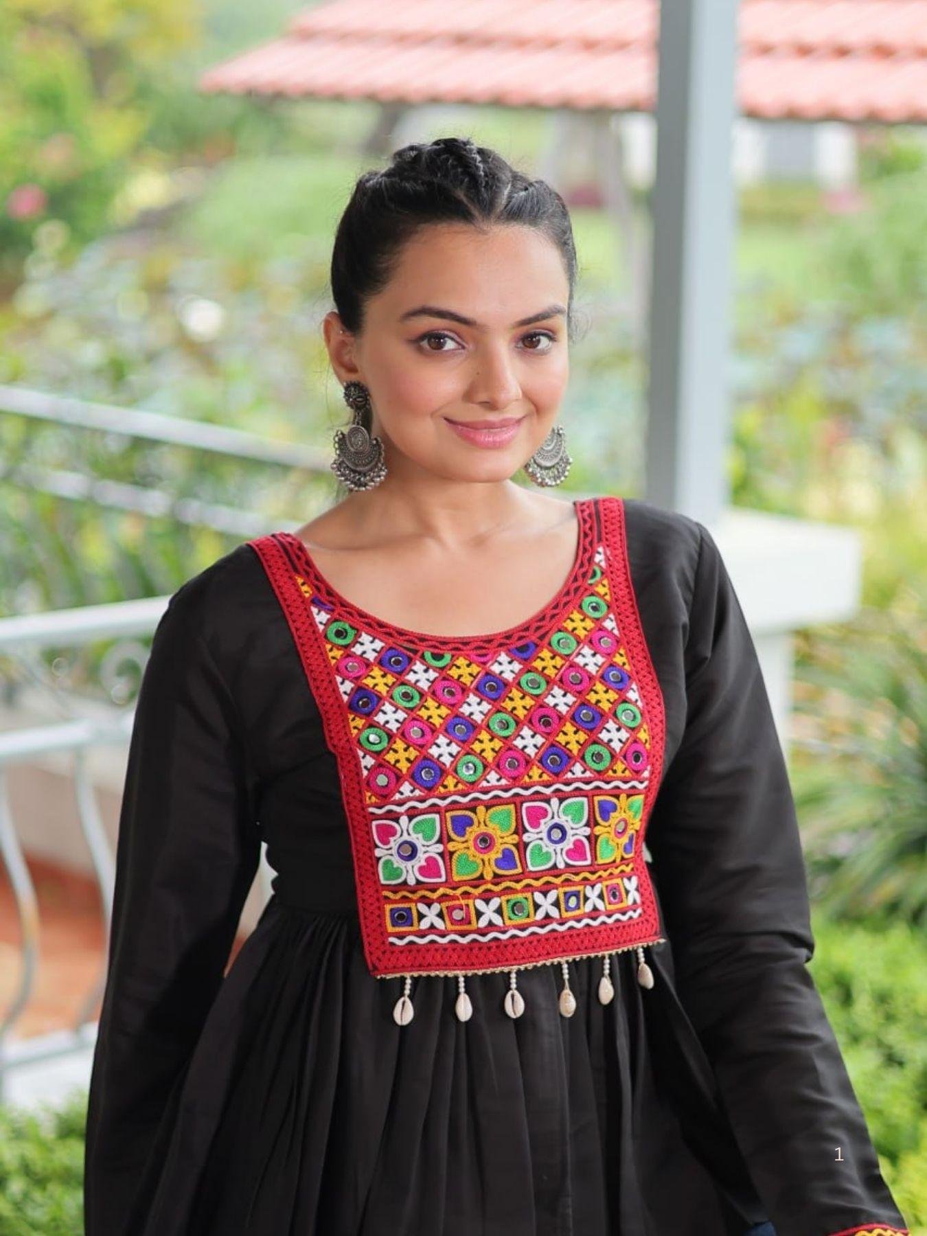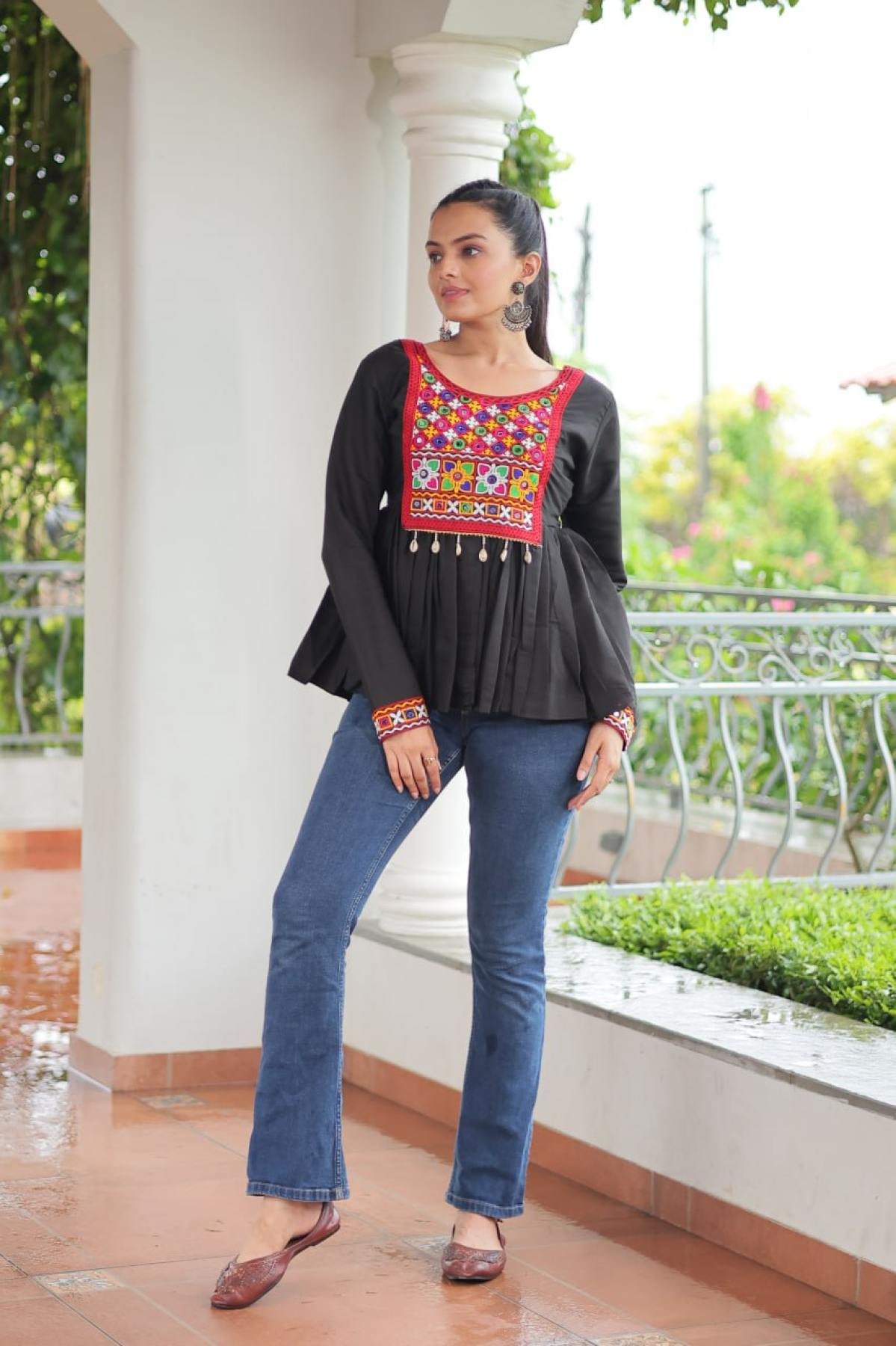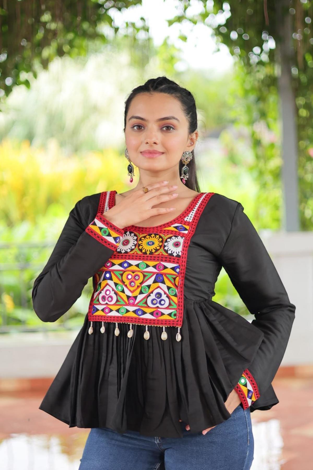 Elevate your festive wardrobe with this Black Kutchi Gamthi Work Peplum Top – perfect for traditional Garba nights and cultural events.