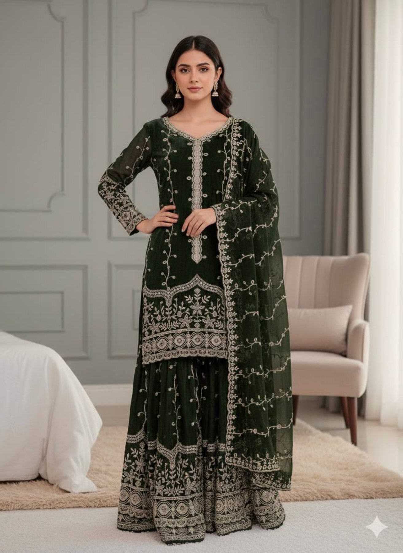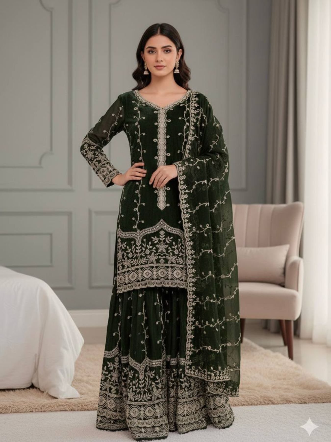 Experience luxury with this premium Pure Fendy Silk three-piece suit set, crafted with rich embroidery and shimmering sequin work. The fully stitched top and pant ensure comfort and style, while the beautifully embroidered dupatta completes the designer look. Perfect for weddings, festive functions, and party wear at premium yet wholesale-friendly pricing.