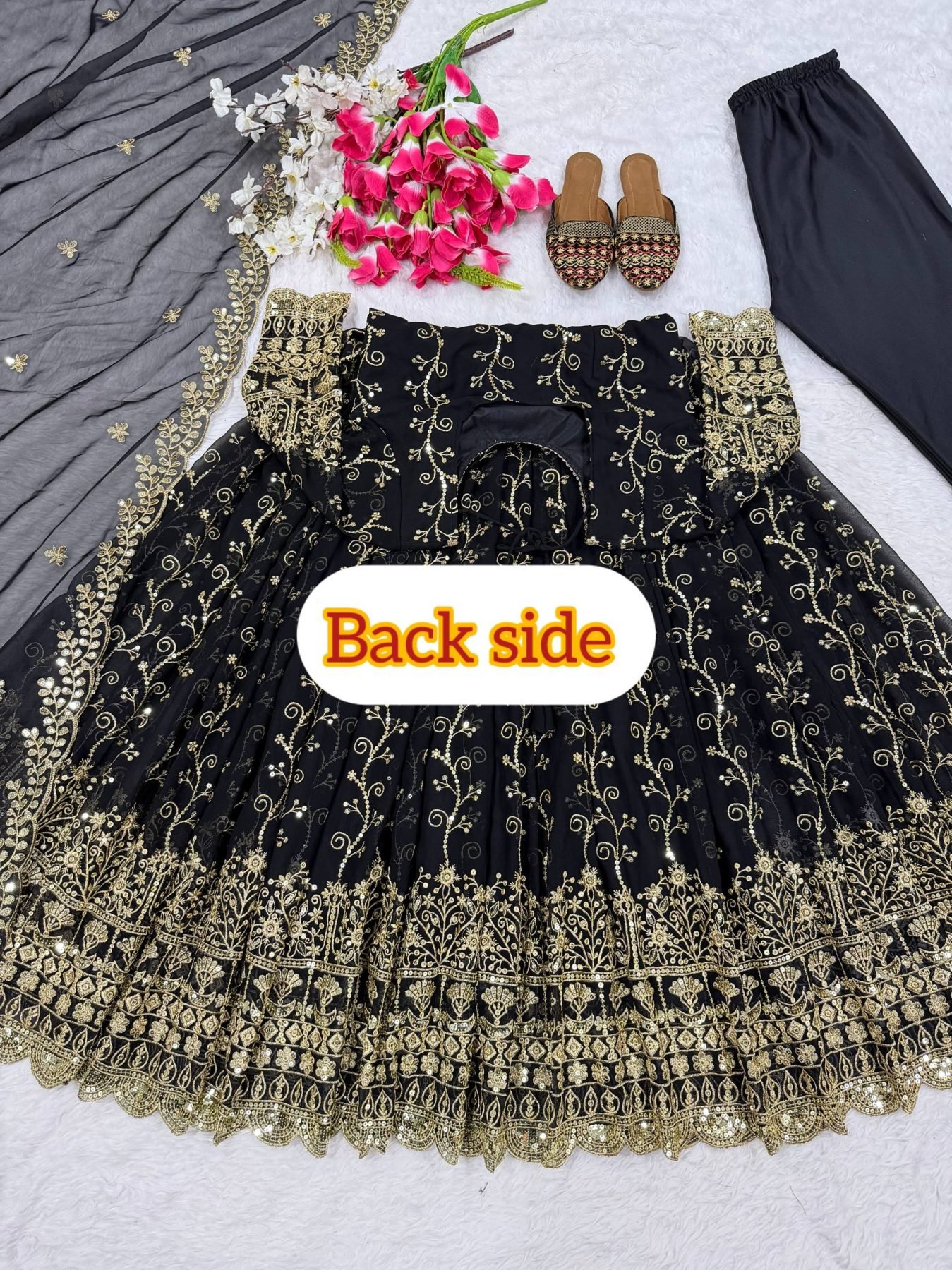 Blooming Black Faux Georgette Anarkali Suit with 3 5m Flair Chudi Pant With Fancy Dupatta at Manufacturer Price