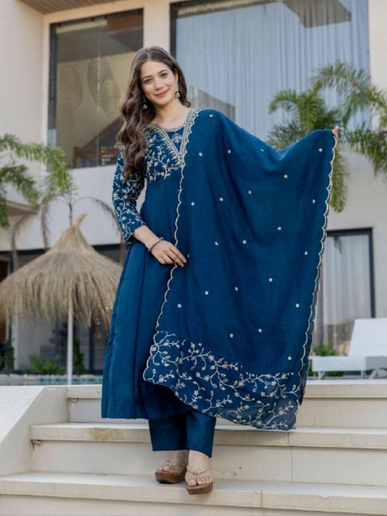 Blue Color Vichitra Silk Anarkali Kurta Set With Duppata At Wholesale Rates