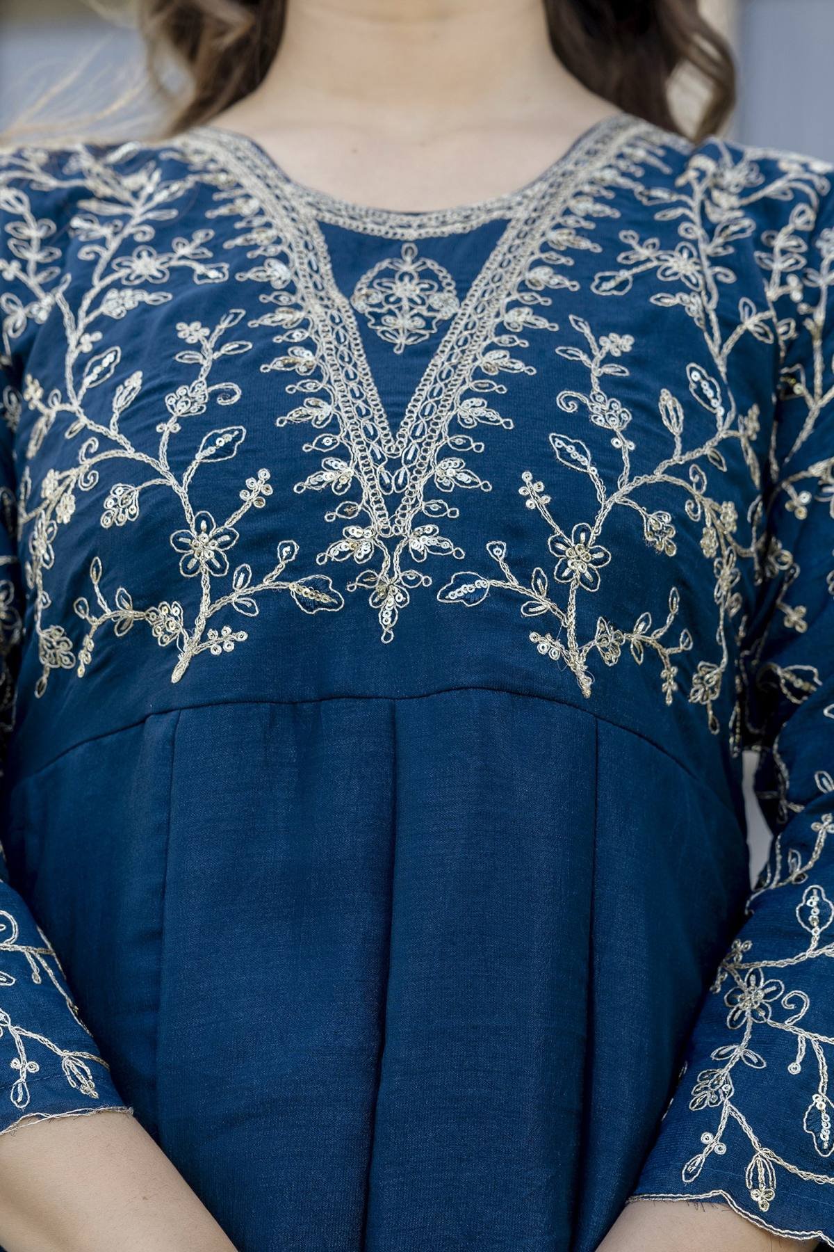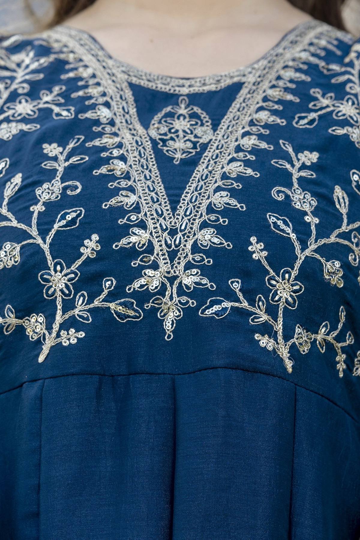 Designed with intricate embroidery detailing and paired with a matching Vichitra Dupatta and Chanderi pants, this ensemble redefines festive and office wear charm.