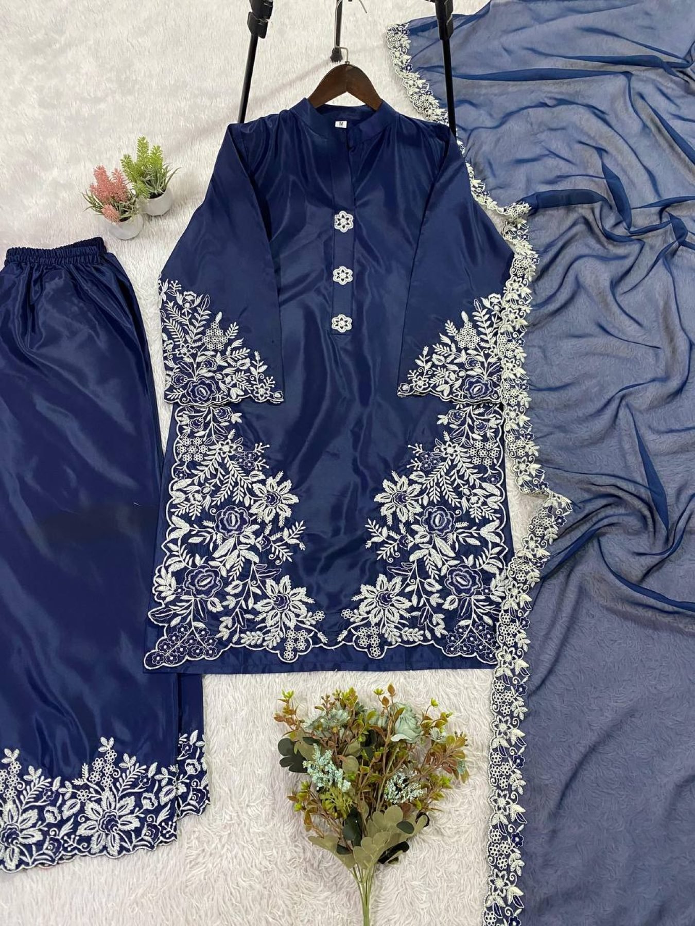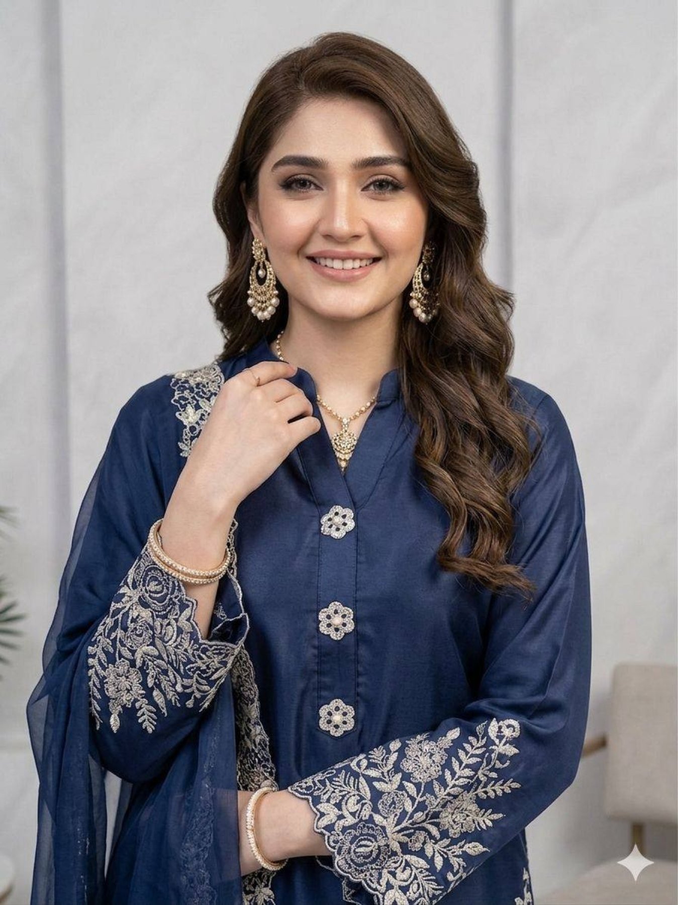 Elegant Pakistani-style crape silk suit set with beautiful embroidery work, paired with matching plazzo and soft organza dupatta. Perfect for festive wear, parties, and wedding occasions.
