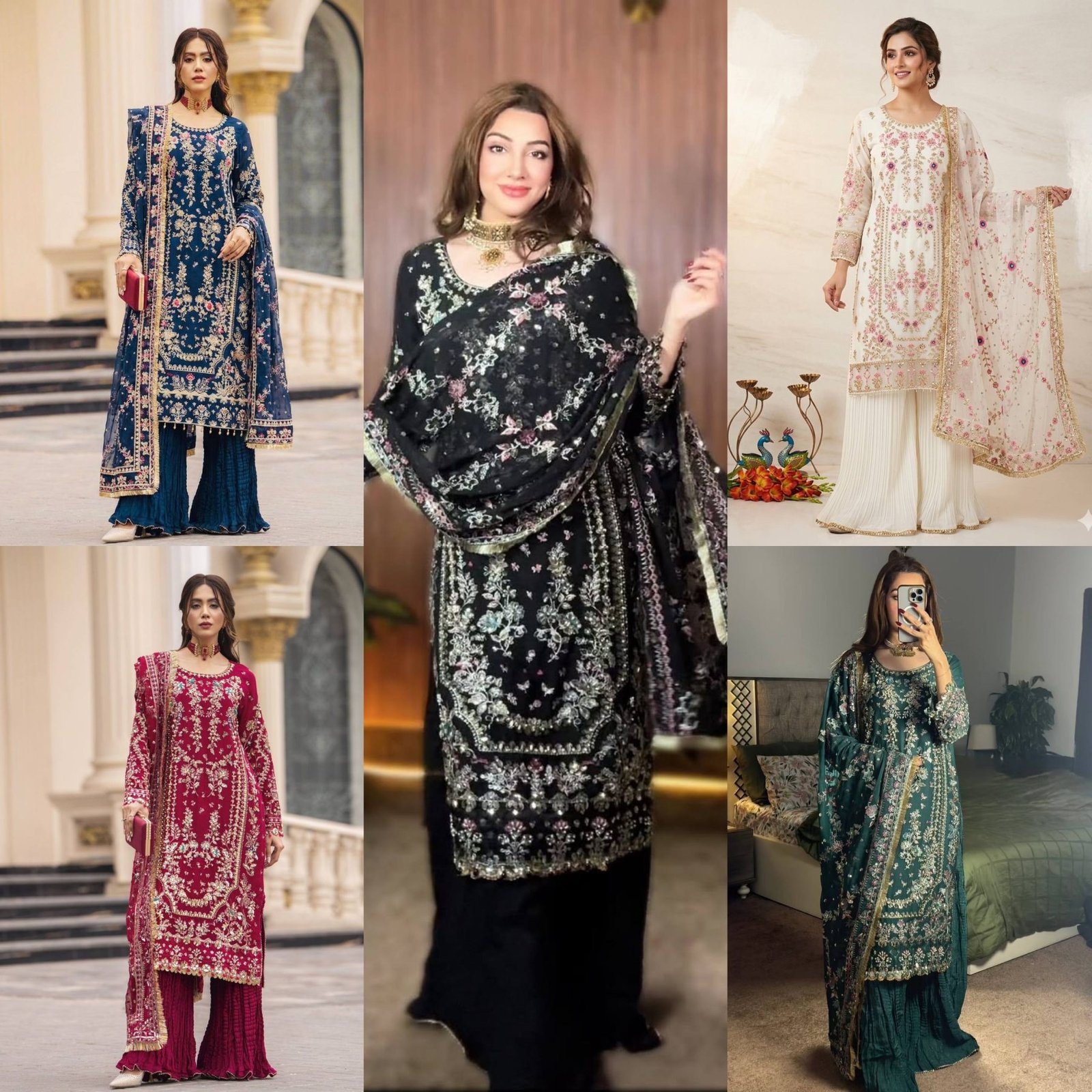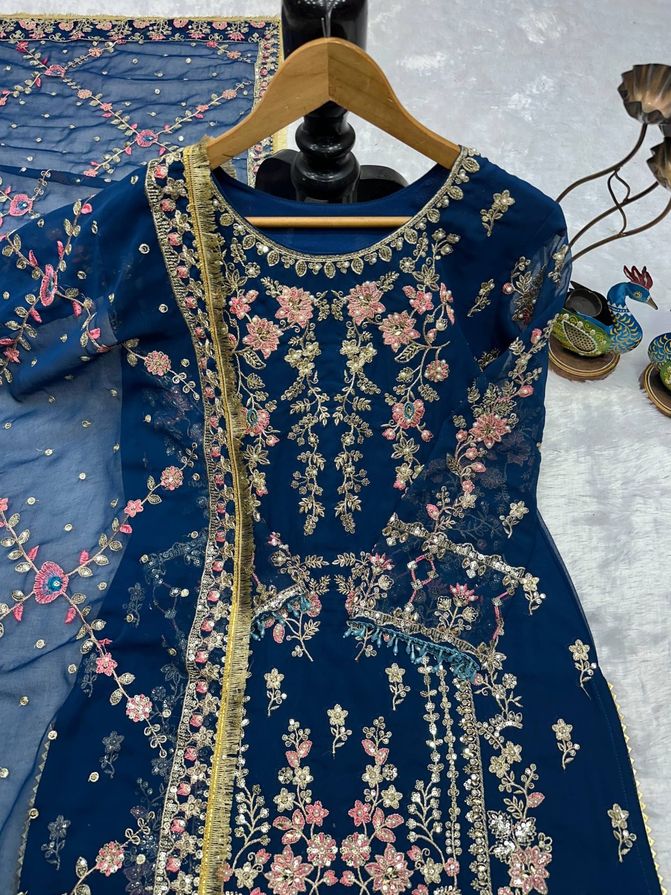 Premium fox georgette suit set featuring heavy embroidery with moti and mirror work, paired with stylish crush pant and embroidered lace dupatta. Perfect for wedding, festive, and party wear with a rich designer look.