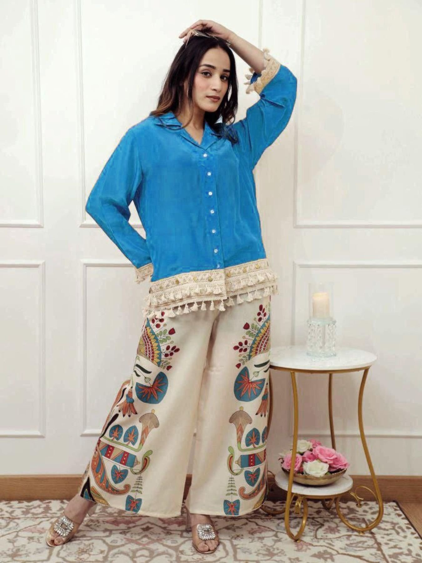 Blue Pure Cotton A Line Top with Lace Border and Palazzo Pants Elegant Casual Wear