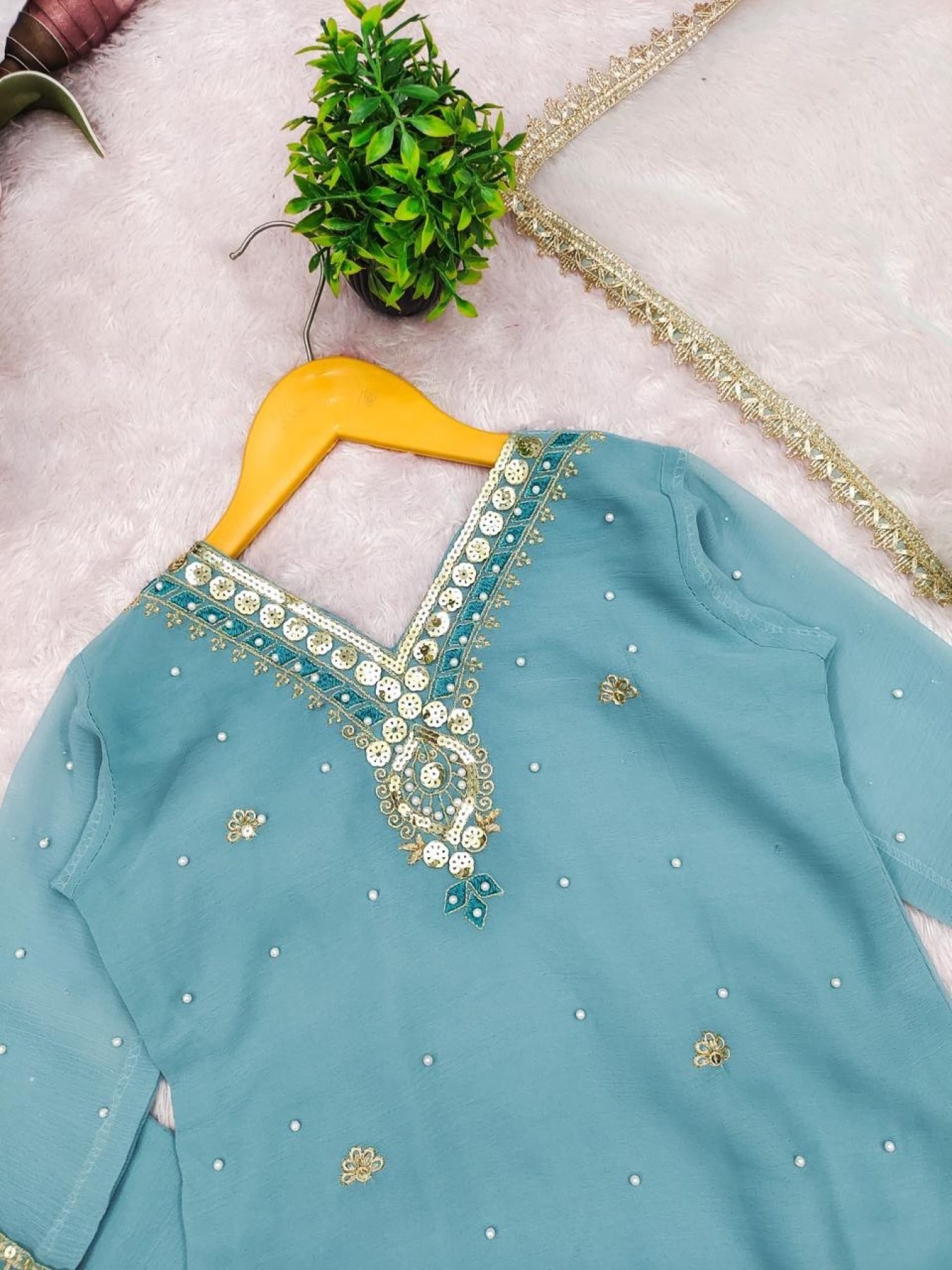 Designer kids sharara set crafted in heavy faux georgette featuring embroidery chain work with diamond hand work detailing. Comes with matching dupatta, perfect for festive occasions and party wear.