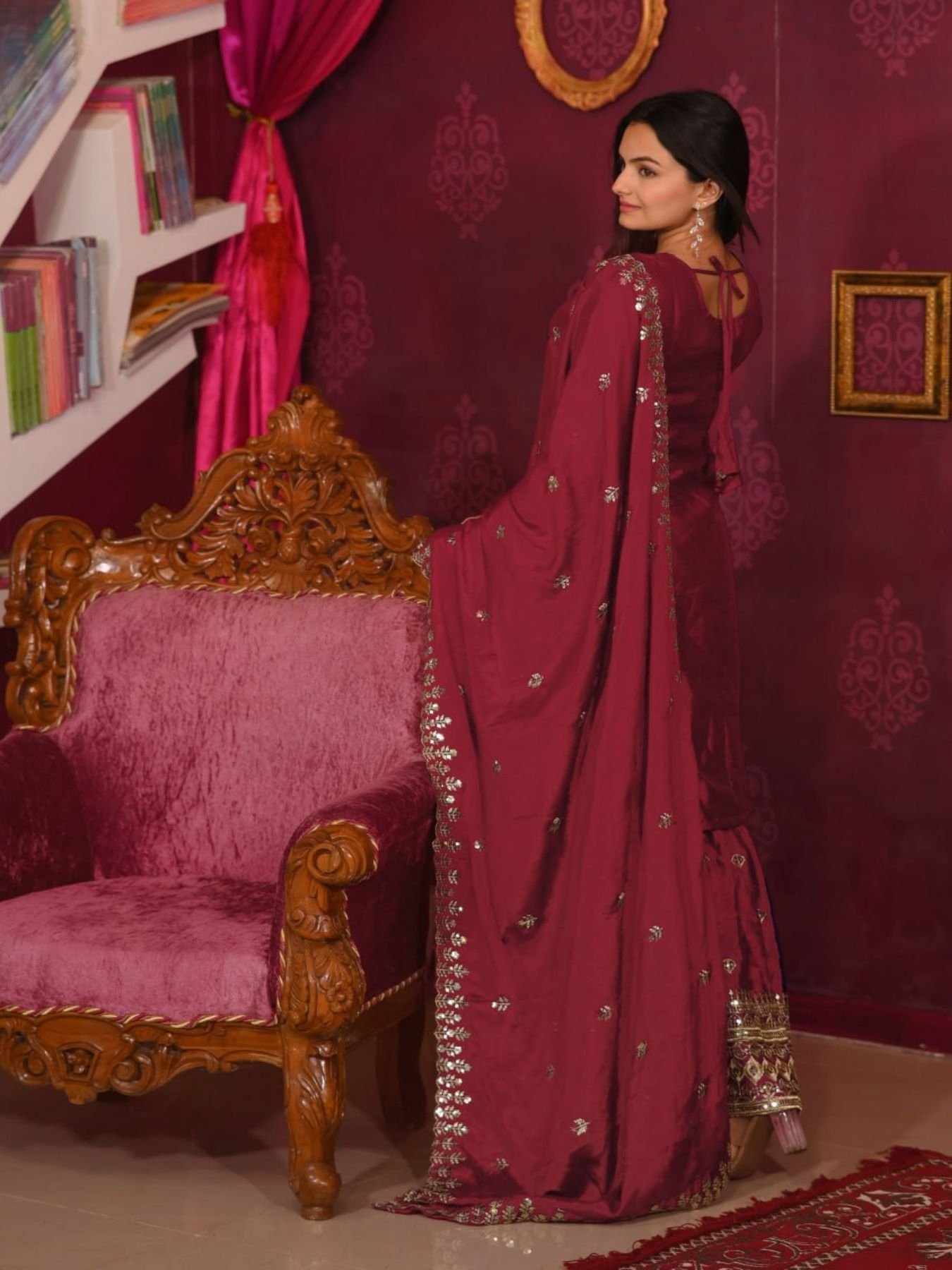 This designer sharara suit set is perfect for women who want to make a statement at any traditional event. The Chinon fabric adds a soft, luxurious feel, while the sequence embroidery brings just the right touch of glamor. The comfortable micro lining and elastic waistband make it practical for long wear while ensuring you look fabulous all day or night.